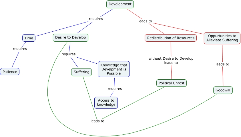 This Concept Map, created with IHMC CmapTools, has information related to: ryanlavoie philosophy, Desire to Develop requires Suffering, Development leads to Oppurtunities to Alleviate Suffering, Political Unrest leads to Suffering, Knowledge that Develpment is Possible requires Access to knowledge, Desire to Develop requires Knowledge that Develpment is Possible, Time requires Patience, Redistribution of Resources without Desire to Develop leads to Political Unrest, Development requires Time, Development requires Desire to Develop, Development leads to Redistribution of Resources, Oppurtunities to Alleviate Suffering leads to Goodwill, Goodwill Desire to Develop