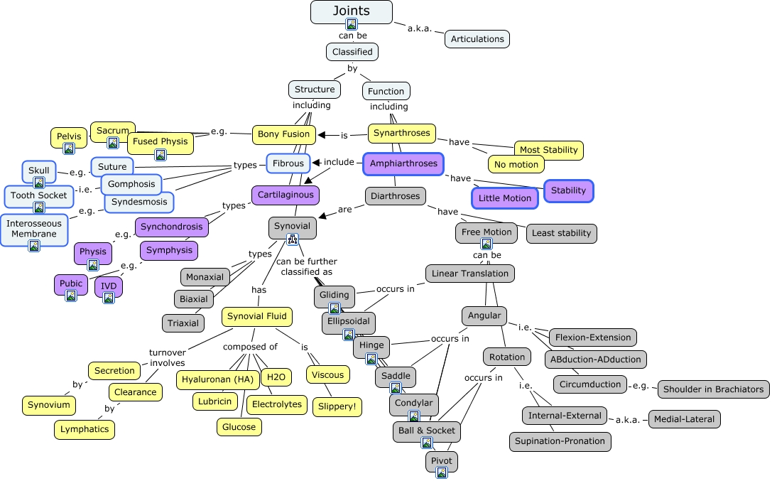 This Concept Map, created with IHMC CmapTools, has information related to: Arthrology2, Classified by Function, Diarthroses have Least stability, Synovial can be further classified as Saddle, Bony Fusion e.g. Fused Physis, Synovial types Biaxial, Synovial Fluid is Viscous, Synarthroses have No motion, Suture e.g. Skull, Angular occurs in Hinge, Free Motion can be Linear Translation, Fibrous types Suture, Fibrous types Syndesmosis, Synovial Fluid composed of H2O, Free Motion can be Rotation, Rotation i.e. Internal-External, Structure including Synovial, Amphiarthroses include Fibrous, Linear Translation occurs in Gliding, Angular i.e. ABduction-ADduction, Synovial can be further classified as Pivot