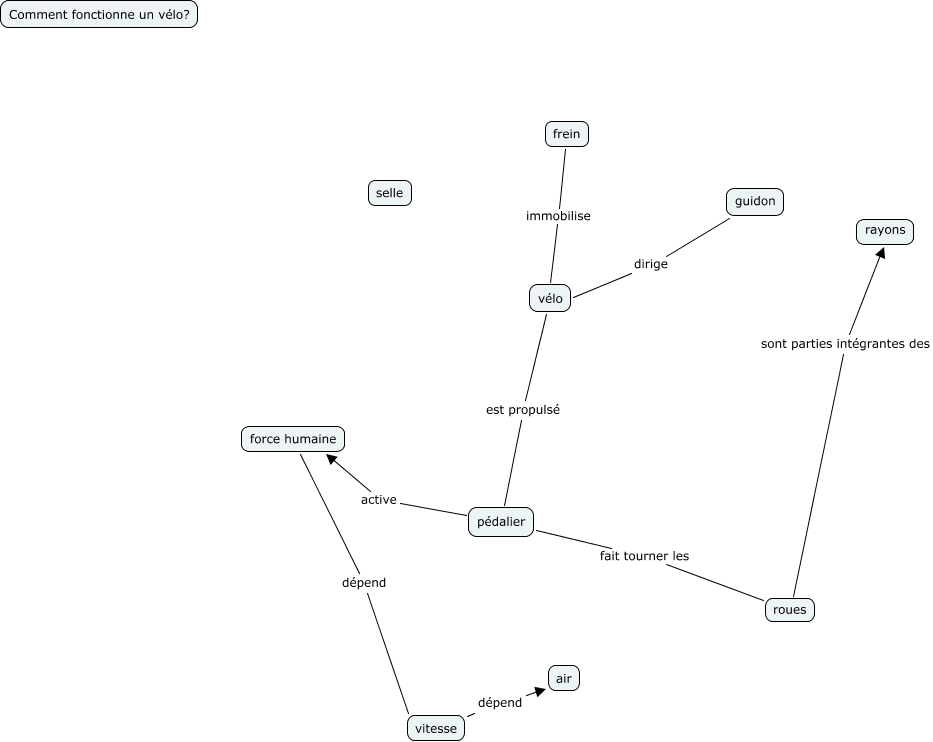 Cette carte de concepts créée avec IHMC CmapTools traite de: Comment fonctionne un vélo, pédalier fait tourner les roues, roues sont parties intégrantes des rayons, vélo est propulsé pédalier, frein immobilise vélo, force humaine dépend vitesse, pédalier active force humaine, vitesse dépend air, guidon dirige vélo