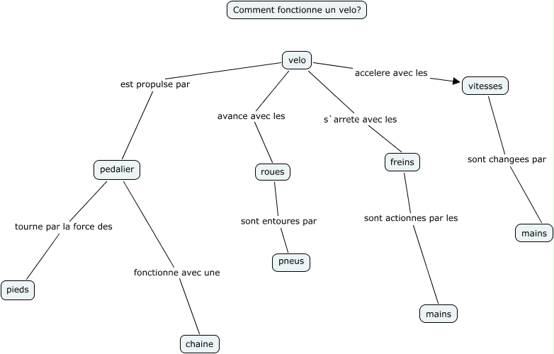 Cette carte de concepts créée avec IHMC CmapTools traite de: fonctionnement dùn velo, pedalier fonctionne avec une chaine, pedalier tourne par la force des pieds, velo s`arrete avec les freins, roues sont entoures par pneus, velo est propulse par pedalier, velo avance avec les roues, freins sont actionnes par les mains, vitesses sont changees par mains, velo accelere avec les vitesses