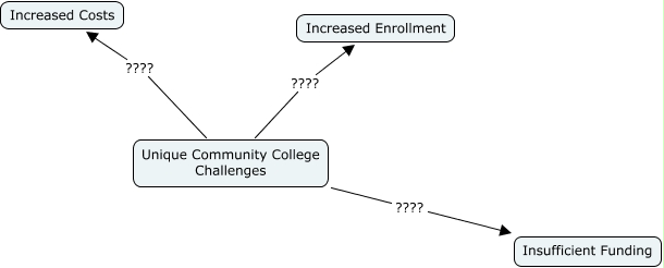 This Concept Map, created with IHMC CmapTools, has information related to: WilliamsLV EDHE695 Week 2, Unique Community College Challenges ???? Increased Enrollment, Unique Community College Challenges ???? Insufficient Funding, Unique Community College Challenges ???? Increased Costs