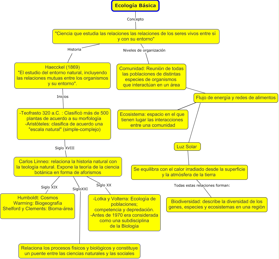 Este Cmap, tiene información relacionada con: carte conceptuelle, Carlos Linneo: relaciona la historia natural con la teología natural. Expone la teoría de la ciencia botánica en forma de aforismos Siglo XIX Humboldt: Cosmos Warming: Biogeografía Shelford y Clements: Bioma-área, Ecología Básica Concepto "Ciencia que estudia las relaciones las relaciones de los seres vivos entre sí y con su entorno", Luz Solar ???? Se equilibra con el calor irradiado desde la superficie y la atmósfera de la tierra, Carlos Linneo: relaciona la historia natural con la teología natural. Expone la teoría de la ciencia botánica en forma de aforismos SigloXXI Relaciona los procesos físicos y biológicos y constituye un puente entre las ciencias naturales y las sociales, -Teofrasto 320 a.C. : Clasificó más de 500 plantas de acuerdo a su morfología -Aristóteles: clasifica de acuerdo una "escala natural" (simple-complejo) Siglo XVIII Carlos Linneo: relaciona la historia natural con la teología natural. Expone la teoría de la ciencia botánica en forma de aforismos, Carlos Linneo: relaciona la historia natural con la teología natural. Expone la teoría de la ciencia botánica en forma de aforismos Siglo XX -Lotka y Volterra: Ecología de poblaciones; competencia y depredación. -Antes de 1970 era considerada como una subdisciplina de la Biología, "Ciencia que estudia las relaciones las relaciones de los seres vivos entre sí y con su entorno" Niveles de organización Comunidad: Reunión de todas las poblaciones de distintas especies de organismos que interactúan en un área, Haecckel (1869) "El estudio del entorno natural, incluyendo las relaciones mutuas entre los organismos y su entorno". Inicios -Teofrasto 320 a.C. : Clasificó más de 500 plantas de acuerdo a su morfología -Aristóteles: clasifica de acuerdo una "escala natural" (simple-complejo), "Ciencia que estudia las relaciones las relaciones de los seres vivos entre sí y con su entorno" Historia Haecckel (1869) "El estudio del entorno natural, incluyendo las relaciones mutuas entre los organismos y su entorno"., Se equilibra con el calor irradiado desde la superficie y la atmósfera de la tierra Todas estas relaciones forman: Biodiversidad: describe la diversidad de los genes, especies y ecosistemas en una región, Comunidad: Reunión de todas las poblaciones de distintas especies de organismos que interactúan en un área Ecosistema: espacio en el que tienen lugar las interacciones entre una comunidad