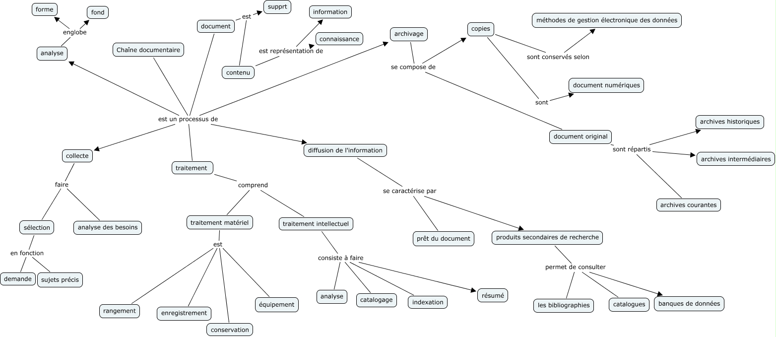 Cette carte de concepts créée avec IHMC CmapTools traite de: chaine documentaire, traitement matériel est enregistrement, Chaîne documentaire est un processus de collecte, traitement matériel est conservation, archivage se compose de document original, traitement intellectuel consiste à faire analyse, diffusion de l'information se caractérise par produits secondaires de recherche, Chaîne documentaire est un processus de archivage, sélection en fonction demande, analyse englobe fond, document est un processus de traitement, archivage se compose de copies, document original sont répartis archives intermédiaires, traitement matériel est équipement, document est un processus de collecte, document original sont répartis archives courantes, collecte faire sélection, diffusion de l'information se caractérise par prêt du document, copies sont document numériques, traitement intellectuel consiste à faire catalogage, document est un processus de archivage
