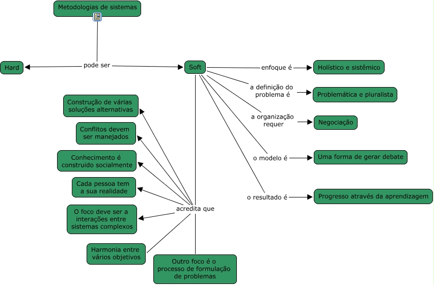 Esse mapa conceitual, produzido no IHMC CmapTools, tem a informação relacionada a: metodologiaSoft, Metodologias de sistemas pode ser Soft, Metodologias de sistemas pode ser Hard, Soft acredita que Outro foco é o processo de formulação de problemas, Soft a organização requer Negociação, Soft acredita que Construção de várias soluções alternativas, Soft acredita que Conflitos devem ser manejados, Soft enfoque é Holístico e sistêmico, Soft o resultado é Progresso através da aprendizagem, Soft a definição do problema é Problemática e pluralista, Soft acredita que Conhecimento é construido socialmente, Soft acredita que O foco deve ser a interações entre sistemas complexos, Soft o modelo é Uma forma de gerar debate, Soft acredita que Harmonia entre vários objetivos, Soft acredita que Cada pessoa tem a sua realidade