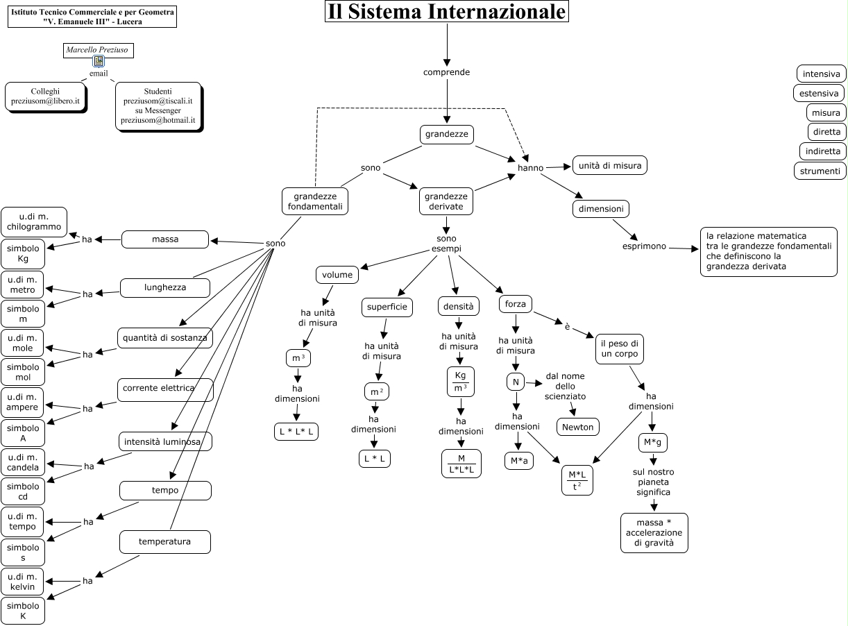 This Concept Map, created with IHMC CmapTools, has information related to: Il Sistema Internazionale - mappa, grandezze sono grandezze fondamentali, <math xmlns="http://www.w3.org/1998/Math/MathML"> <mrow> <mfrac> <mtext> Kg </mtext> <mrow> <mmultiscripts> <mtext> m </mtext> <none/> <mtext> 3 </mtext> </mmultiscripts> </mrow> </mfrac> </mrow> </math> ha dimensioni <math xmlns="http://www.w3.org/1998/Math/MathML"> <mrow> <mfrac> <mtext> M </mtext> <mtext> L*L*L </mtext> </mfrac> </mrow> </math>, N ha dimensioni <math xmlns="http://www.w3.org/1998/Math/MathML"> <mrow> <mfrac> <mtext> M*L </mtext> <mmultiscripts> <mtext> t </mtext> <none/> <mtext> 2 </mtext> </mmultiscripts> </mfrac> </mrow> </math>, Il Sistema Internazionale comprende grandezze, grandezze hanno unità di misura, lunghezza ha u.di m. metro, grandezze fondamentali sono quantità di sostanza, forza è il peso di un corpo, N ha dimensioni M*a, Marcello Preziuso email Studenti preziusom@tiscali.it su Messenger preziusom@hotmail.it, grandezze sono grandezze derivate, grandezze fondamentali sono lunghezza, quantità di sostanza ha u.di m. mole, grandezze derivate hanno dimensioni, M*g sul nostro pianeta significa massa * accelerazione di gravità, intensità luminosa ha simbolo cd, grandezze derivate sono esempi superficie, il peso di un corpo ha dimensioni M*g, superficie ha unità di misura <math xmlns="http://www.w3.org/1998/Math/MathML"> <mrow> <mmultiscripts> <mtext> m </mtext> <none/> <mtext> 2 </mtext> </mmultiscripts> </mrow> </math>, grandezze derivate hanno unità di misura