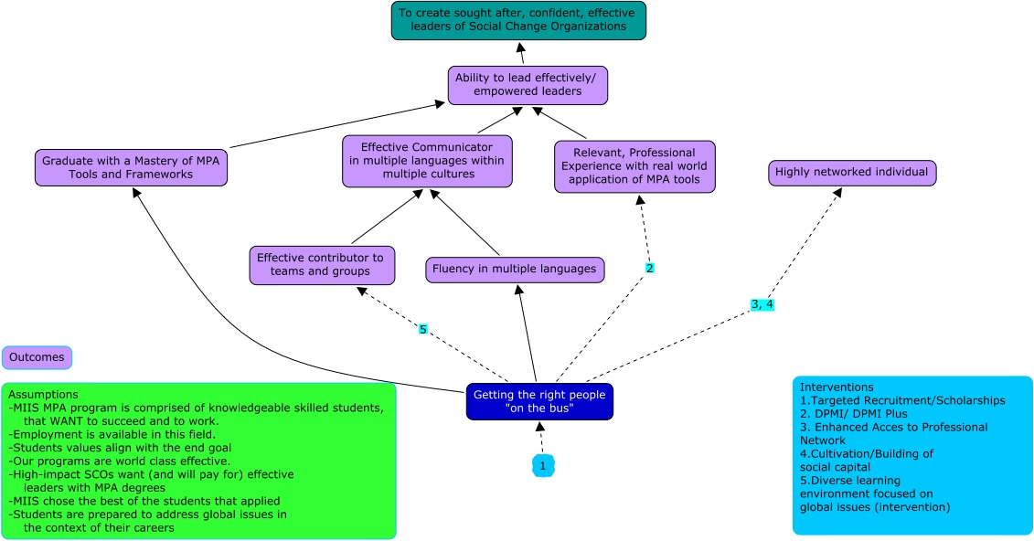 This Concept Map, created with IHMC CmapTools, has information related to: MPA CMap, Getting the right people "on the bus" Graduate with a Mastery of MPA Tools and Frameworks, Getting the right people "on the bus" Fluency in multiple languages, Graduate with a Mastery of MPA Tools and Frameworks Ability to lead effectively/ empowered leaders, 1 Getting the right people "on the bus", Getting the right people "on the bus" 3, 4 Highly networked individual, Getting the right people "on the bus" 2 Relevant, Professional Experience with real world application of MPA tools, Effective Communicator in multiple languages within multiple cultures Ability to lead effectively/ empowered leaders, Fluency in multiple languages Effective Communicator in multiple languages within multiple cultures, Getting the right people "on the bus" 5 Effective contributor to teams and groups, Effective contributor to teams and groups Effective Communicator in multiple languages within multiple cultures, Relevant, Professional Experience with real world application of MPA tools Ability to lead effectively/ empowered leaders, Ability to lead effectively/ empowered leaders To create sought after, confident, effective leaders of Social Change Organizations