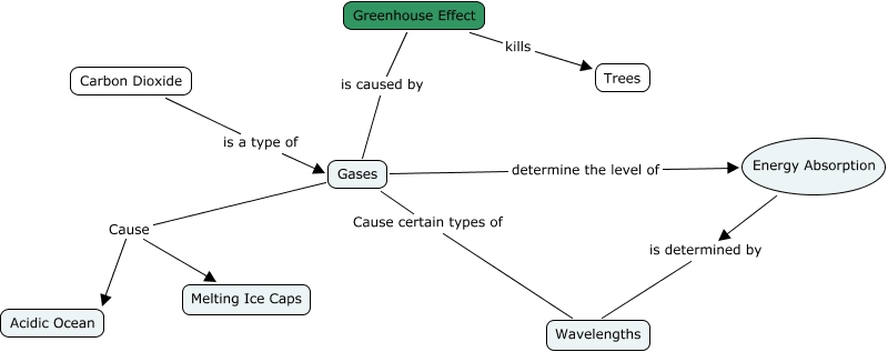 This Concept Map, created with IHMC CmapTools, has information related to: Lindsey S. cmap, Carbon Dioxide is a type of Gases, Greenhouse Effect kills Trees, Gases Cause certain types of Wavelengths, Energy Absorption is determined by Wavelengths, Gases determine the level of Energy Absorption, Gases Cause Melting Ice Caps, Gases Cause Acidic Ocean, Greenhouse Effect is caused by Gases