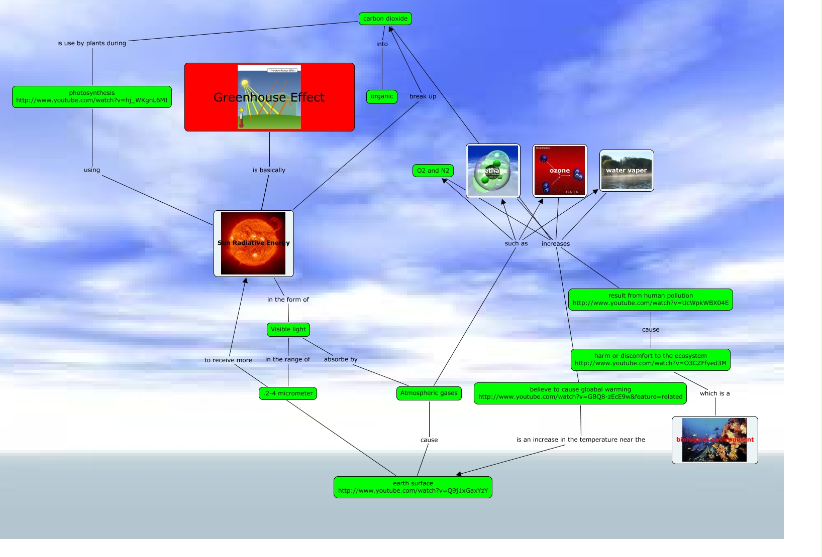 This Concept Map, created with IHMC CmapTools, has information related to: tien cmap, Sun Radiative Energy in the form of Visible light, ozone increases result from human pollution http://www.youtube.com/watch?v=UcWpkWBX04E, methane increases result from human pollution http://www.youtube.com/watch?v=UcWpkWBX04E, Sun Radiative Energy break up carbon dioxide, methane increases believe to cause gloabal warming http://www.youtube.com/watch?v=GBQ8-zEcE9w&feature=related, water vaper increases result from human pollution http://www.youtube.com/watch?v=UcWpkWBX04E, ozone increases believe to cause gloabal warming http://www.youtube.com/watch?v=GBQ8-zEcE9w&feature=related, photosynthesis http://www.youtube.com/watch?v=hj_WKgnL6MI using Sun Radiative Energy, Atmospheric gases such as water vaper, carbon dioxide is use by plants during photosynthesis http://www.youtube.com/watch?v=hj_WKgnL6MI, Visible light in the range of .2-4 micrometer, Visible light absorbe by Atmospheric gases, Greenhouse Effect is basically Sun Radiative Energy, carbon dioxide increases believe to cause gloabal warming http://www.youtube.com/watch?v=GBQ8-zEcE9w&feature=related, harm or discomfort to the ecosystem http://www.youtube.com/watch?v=O3CZFfyed3M which is a biological environment, Greenhouse Effect is basically Sun Radiative Energy, result from human pollution http://www.youtube.com/watch?v=UcWpkWBX04E cause harm or discomfort to the ecosystem http://www.youtube.com/watch?v=O3CZFfyed3M, Atmospheric gases such as ozone, Atmospheric gases cause earth surface http://www.youtube.com/watch?v=Q9j1xGaxYzY, carbon dioxide into organic