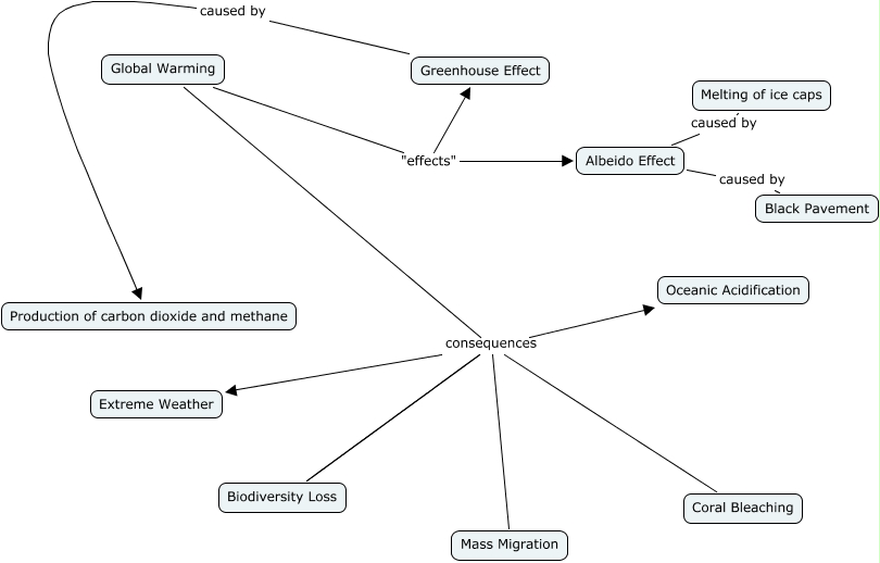 This Concept Map, created with IHMC CmapTools, has information related to: Bryce.R, Albeido Effect caused by Black Pavement, Global Warming consequences Coral Bleaching, Global Warming "effects" Greenhouse Effect, Global Warming consequences Extreme Weather, Global Warming consequences Biodiversity Loss, Global Warming consequences Oceanic Acidification, Greenhouse Effect caused by Production of carbon dioxide and methane, Albeido Effect caused by Melting of ice caps, Global Warming consequences Mass Migration, Global Warming "effects" Albeido Effect, Global Warming consequences Biodiversity Loss