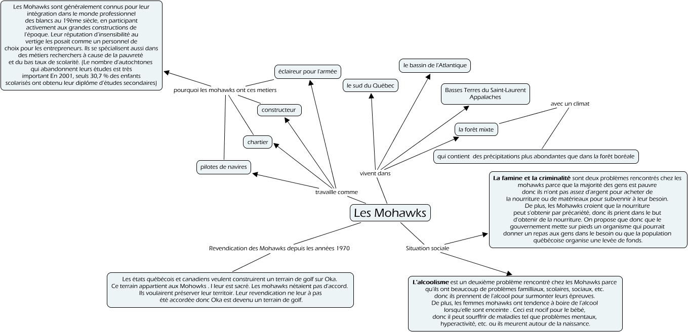 Cette carte conceptuelle, cree avec IHMC CmapTools, contient des informations liees a : Les Mohawks, Les Mohawks vivent dans le bassin de l'Atlantique, constructeur pourquoi les mohawks ont ces metiers Les Mohawks sont généralement connus pour leur intégration dans le monde professionnel des blancs au 19ème siècle, en participant activement aux grandes constructions de l’époque. Leur réputation d’insensibilité au vertige les posait comme un personnel de choix pour les entrepreneurs. Ils se spécialisent aussi dans des métiers recherchers à cause de la pauvreté et du bas taux de scolarité. (Le nombre d'autochtones qui abandonnent leurs études est très important En 2001, seuls 30,7 % des enfants scolarisés ont obtenu leur diplôme d’études secondaires), Les Mohawks Revendication des Mohawks depuis les années 1970 Les états québécois et canadiens veulent construirent un terrain de golf sur Oka. Ce terrain appartient aux Mohowks . I leur est sacré. Les mohawks nétaient pas d'accord. Ils voulairent préserver leur territoir. Leur revendication ne leur à pas été accordée donc Oka est devenu un terrain de golf., chartier pourquoi les mohawks ont ces metiers Les Mohawks sont généralement connus pour leur intégration dans le monde professionnel des blancs au 19ème siècle, en participant activement aux grandes constructions de l’époque. Leur réputation d’insensibilité au vertige les posait comme un personnel de choix pour les entrepreneurs. Ils se spécialisent aussi dans des métiers recherchers à cause de la pauvreté et du bas taux de scolarité. (Le nombre d'autochtones qui abandonnent leurs études est très important En 2001, seuls 30,7 % des enfants scolarisés ont obtenu leur diplôme d’études secondaires), Les Mohawks travaille comme pilotes de navires, Les Mohawks travaille comme chartier, pilotes de navires pourquoi les mohawks ont ces metiers Les Mohawks sont généralement connus pour leur intégration dans le monde professionnel des blancs au 19ème siècle, en participant activement aux grandes constructions de l’époque. Leur réputation d’insensibilité au vertige les posait comme un personnel de choix pour les entrepreneurs. Ils se spécialisent aussi dans des métiers recherchers à cause de la pauvreté et du bas taux de scolarité. (Le nombre d'autochtones qui abandonnent leurs études est très important En 2001, seuls 30,7 % des enfants scolarisés ont obtenu leur diplôme d’études secondaires), Les Mohawks Situation sociale La famine et la criminalité sont deux problèmes rencontrés chez les mohawks parce que la majorité des gens est pauvre donc ils n'ont pas assez d'argent pour acheter de la nourriture ou de matérieaux pour subvennir à leur besoin. De plus, les Mohawks croient que la nourriture peut s'obtenir par précariété, donc ils prient dans le but d'obtenir de la nourriture. On propose que donc que le gouvernement mette sur pieds un organisme qui pourrait donner un repas aux gens dans le besoin ou que la population québécoise organise une levée de fonds., Les Mohawks vivent dans la forêt mixte, Les Mohawks travaille comme constructeur, Les Mohawks travaille comme éclaireur pour l'armée, éclaireur pour l'armée pourquoi les mohawks ont ces metiers Les Mohawks sont généralement connus pour leur intégration dans le monde professionnel des blancs au 19ème siècle, en participant activement aux grandes constructions de l’époque. Leur réputation d’insensibilité au vertige les posait comme un personnel de choix pour les entrepreneurs. Ils se spécialisent aussi dans des métiers recherchers à cause de la pauvreté et du bas taux de scolarité. (Le nombre d'autochtones qui abandonnent leurs études est très important En 2001, seuls 30,7 % des enfants scolarisés ont obtenu leur diplôme d’études secondaires), Les Mohawks vivent dans le sud du Québec, Les Mohawks Situation sociale L'alcoolisme est un deuxième problème rencontré chez les Mohawks parce qu'ils ont beaucoup de problèmes familliaux, scolaires, sociaux, etc. donc ils prennent de l'alcool pour surmonter leurs épreuves. De plus, les femmes mohawks ont tendence à boire de l'alcool lorsqu'elle sont enceinte . Ceci est nocif pour le bébé, donc il peut sourffrir de maladies tel que problèmes mentaux, hyperactivité, etc. ou ils meurent autour de la naissance., la forêt mixte avec un climat qui contient des précipitations plus abondantes que dans la forêt boréale, Les Mohawks vivent dans Basses Terres du Saint-Laurent Appalaches