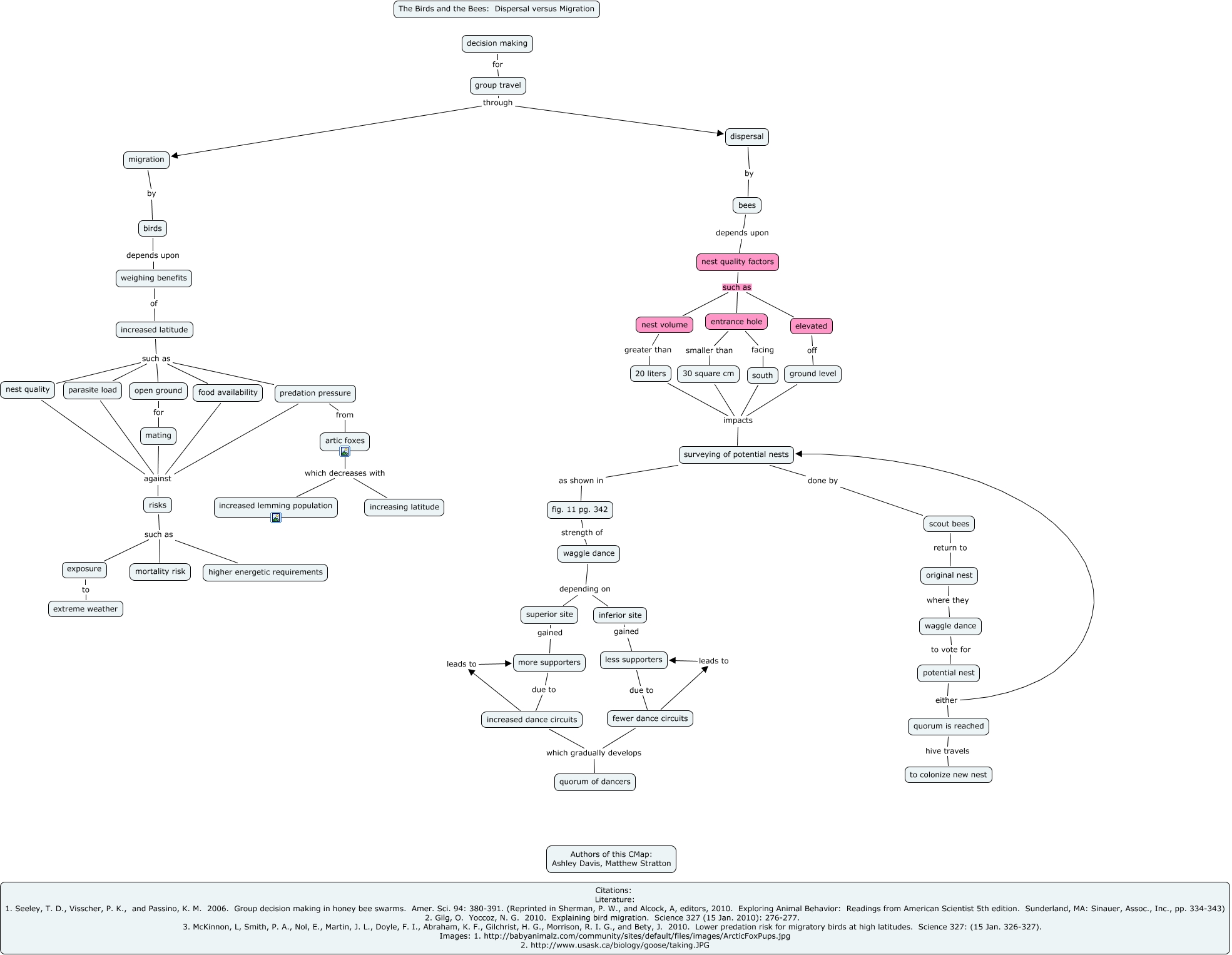 This Concept Map, created with IHMC CmapTools, has information related to: MS AshDav, risks such as exposure, risks such as mortality risk, 20 liters impacts surveying of potential nests, less supporters due to fewer dance circuits, open ground for mating, waggle dance depending on inferior site, increased latitude such as predation pressure, decision making for group travel, ground level impacts surveying of potential nests, elevated off ground level, predation pressure from artic foxes, surveying of potential nests as shown in fig. 11 pg. 342, predation pressure against risks, birds depends upon weighing benefits, entrance hole facing south, superior site gained more supporters, exposure to extreme weather, scout bees return to original nest, artic foxes which decreases with increasing latitude, group travel through dispersal