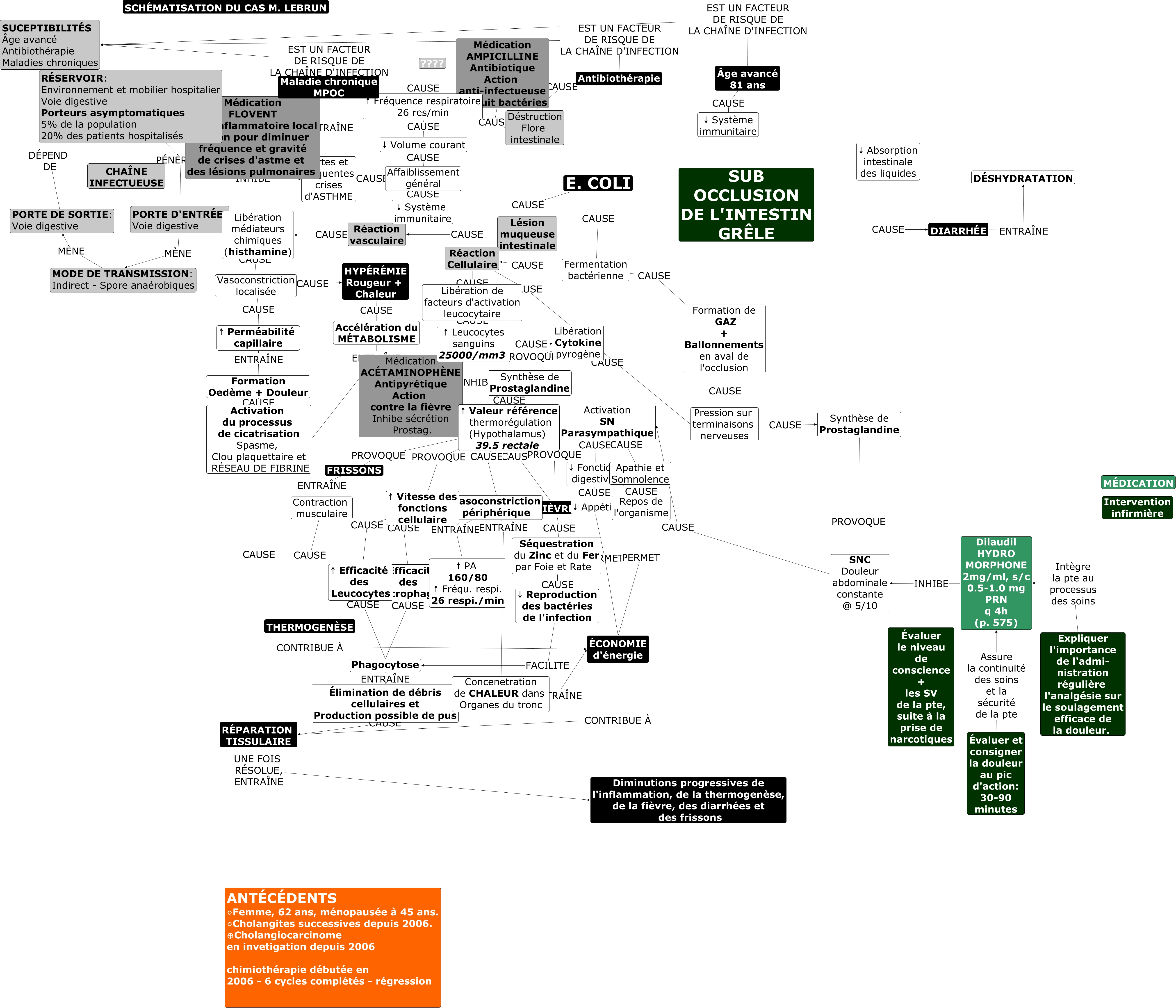 Cette carte de concepts créée avec IHMC CmapTools traite de: LEBRUN, Maladie chronique MPOC ENTRAÎNE Fortes et fréquentes crises d'ASTHME, HYPÉRÉMIE Rougeur + Chaleur CAUSE Accélération du MÉTABOLISME, Évaluer le niveau de conscience + les SV de la pte, suite à la prise de narcotiques Assure la continuité des soins et la sécurité de la pte Dilaudil HYDRO MORPHONE 2mg/ml, s/c 0.5-1.0 mg PRN q 4h (p. 575), ↑ Vitesse des fonctions cellulaire CAUSE ↑ Efficacité des Leucocytes, RÉPARATION TISSULAIRE UNE FOIS RÉSOLUE, ENTRAÎNE Diminutions progressives de l'inflammation, de la thermogenèse, de la fièvre, des diarrhées et des frissons, Concenetration de CHALEUR dans Organes du tronc ENTRAÎNE ÉCONOMIE d'énergie, Pression sur terminaisons nerveuses CAUSE Synthèse de Prostaglandine, Formation de GAZ + Ballonnements en aval de l'occlusion CAUSE Pression sur terminaisons nerveuses, Accélération du MÉTABOLISME ENTRAÎNE Activation du processus de cicatrisation Spasme, Clou plaquettaire et RÉSEAU DE FIBRINE, Contraction musculaire CAUSE THERMOGENÈSE, FIÈVRE CAUSE Séquestration du Zinc et du Fer par Foie et Rate, FRISSONS ENTRAÎNE Contraction musculaire, Maladie chronique MPOC CAUSE ↑ Fréquence respiratoire 26 res/min, ↑ Valeur référence thermorégulation (Hypothalamus) 39.5 rectale PROVOQUE ↑ Vitesse des fonctions cellulaire, Élimination de débris cellulaires et Production possible de pus CAUSE RÉPARATION TISSULAIRE, Réaction vasculaire CAUSE Libération médiateurs chimiques (histhamine), Lésion muqueuse intestinale CAUSE Réaction vasculaire, Réaction Cellulaire CAUSE Pression sur terminaisons nerveuses, ↑ Fréquence respiratoire 26 res/min CAUSE ↓ Volume courant, Synthèse de Prostaglandine PROVOQUE SNC Douleur abdominale constante @ 5/10