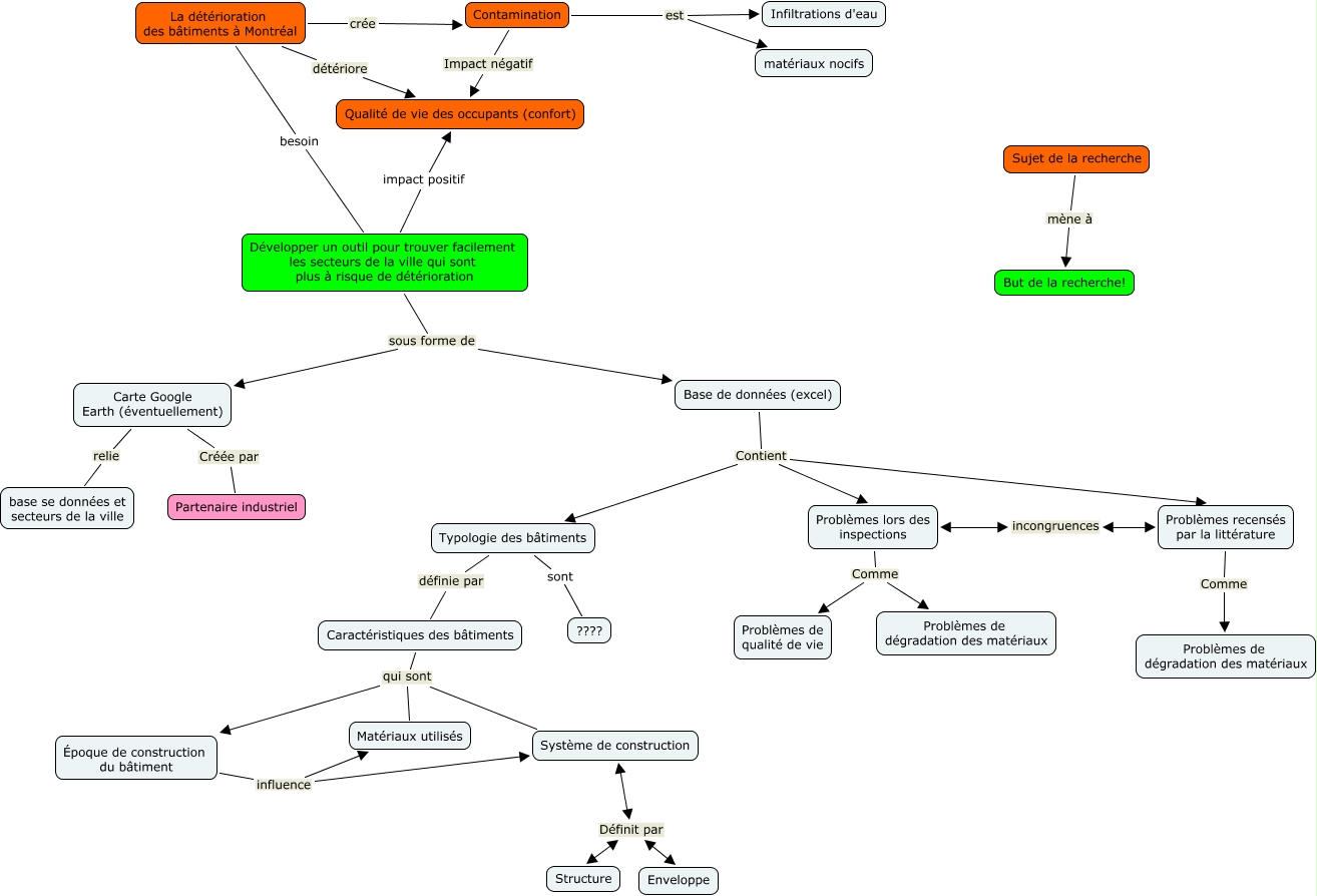 Cette carte de concepts créée avec IHMC CmapTools traite de: Projet Angelica, Problèmes lors des inspections incongruences Problèmes recensés par la littérature, Contamination est Infiltrations d'eau, Développer un outil pour trouver facilement les secteurs de la ville qui sont plus à risque de détérioration impact positif Qualité de vie des occupants (confort), Système de construction Définit par Structure, La détérioration des bâtiments à Montréal détériore Qualité de vie des occupants (confort), Développer un outil pour trouver facilement les secteurs de la ville qui sont plus à risque de détérioration sous forme de Carte Google Earth (éventuellement), La détérioration des bâtiments à Montréal crée Contamination, Base de données (excel) Contient Typologie des bâtiments, Base de données (excel) Contient Problèmes lors des inspections, Caractéristiques des bâtiments qui sont Époque de construction du bâtiment, Typologie des bâtiments définie par Caractéristiques des bâtiments, Base de données (excel) Contient Problèmes recensés par la littérature, La détérioration des bâtiments à Montréal besoin Développer un outil pour trouver facilement les secteurs de la ville qui sont plus à risque de détérioration, Problèmes recensés par la littérature Comme Problèmes de dégradation des matériaux, Développer un outil pour trouver facilement les secteurs de la ville qui sont plus à risque de détérioration sous forme de Base de données (excel), Sujet de la recherche mène à But de la recherche!, Problèmes lors des inspections Comme Problèmes de qualité de vie, Système de construction Définit par Enveloppe, Contamination Impact négatif Qualité de vie des occupants (confort), Caractéristiques des bâtiments qui sont Système de construction