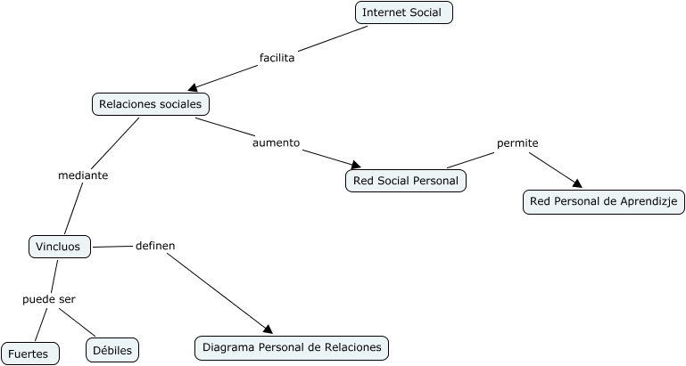 Este Cmap, tiene información relacionada con: internet social, Red Social Personal permite Red Personal de Aprendizje, Internet Social facilita Relaciones sociales, Relaciones sociales aumento Red Social Personal, Vincluos definen Diagrama Personal de Relaciones, Vincluos puede ser Débiles, Vincluos puede ser Fuertes, Relaciones sociales mediante Vincluos