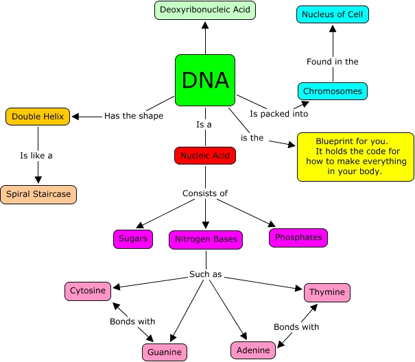 This Concept Map, created with IHMC CmapTools, has information related to: Becky Augustine, Double Helix Is like a Spiral Staircase, Nitrogen Bases Such as Guanine, Nucleic Acid Consists of Phosphates, DNA is the Blueprint for you. It holds the code for how to make everything in your body., Nitrogen Bases Such as Adenine, DNA ???? Deoxyribonucleic Acid, Nitrogen Bases Such as Thymine, Chromosomes Found in the Nucleus of Cell, DNA Is packed into Chromosomes, Nucleic Acid Consists of Sugars, Nitrogen Bases Such as Cytosine, Nucleic Acid Consists of Nitrogen Bases, DNA Is a Nucleic Acid, DNA Has the shape Double Helix