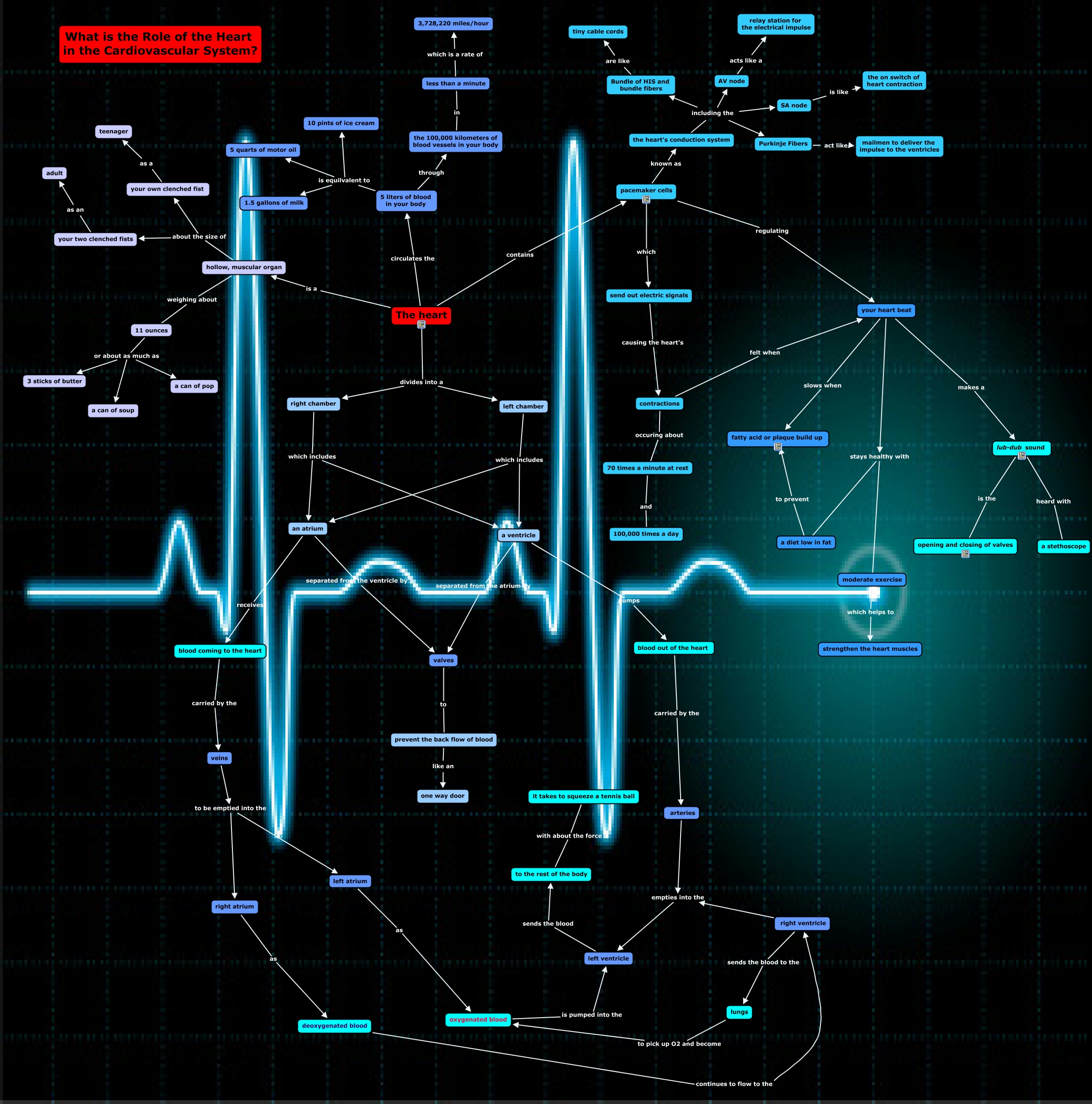 This Concept Map, created with IHMC CmapTools, has information related to: Erin Moran Draft, pacemaker cells which send out electric signals, The heart divides into a right chamber, 5 liters of blood in your body is equilvalent to 1.5 gallons of milk, blood out of the heart carried by the arteries, pacemaker cells regulating your heart beat, a ventricle pumps blood out of the heart, 5 liters of blood in your body through the 100,000 kilometers of blood vessels in your body, SA node is like the on switch of heart contraction, the heart's conduction system including the Bundle of HIS and bundle fibers, left chamber which includes an atrium, an atrium receives blood coming to the heart, left atrium as oxygenated blood, The heart is a hollow, muscular organ, Purkinje Fibers act like mailmen to deliver the impulse to the ventricles, right ventricle sends the blood to the lungs, The heart contains pacemaker cells, your heart beat stays healthy with a diet low in fat, veins to be emptied into the right atrium, 11 ounces or about as much as a can of soup, lub-dub sound heard with a stethoscope