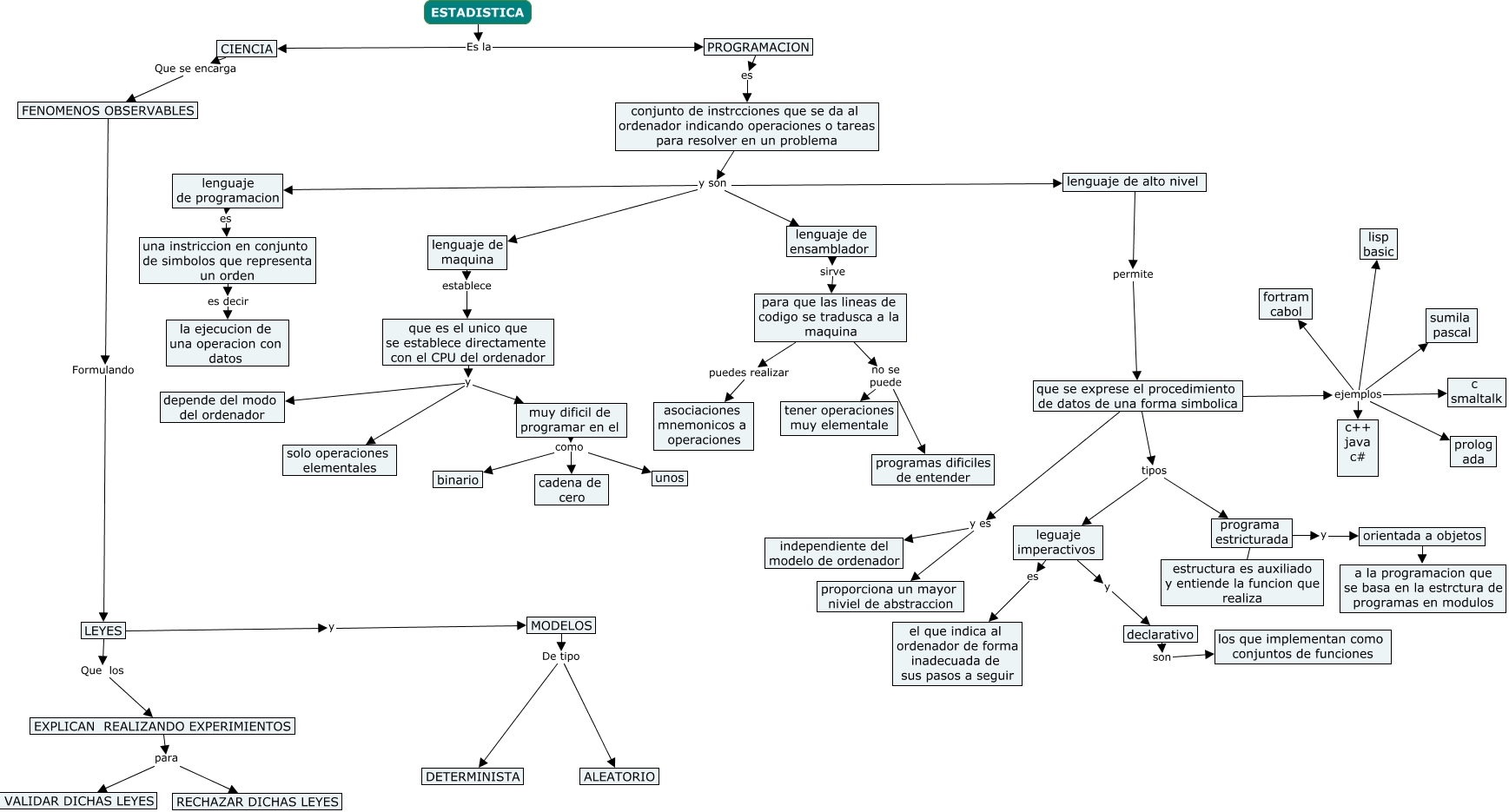 Este Cmap, tiene información relacionada con: entrevista psi, conjunto de instrcciones que se da al ordenador indicando operaciones o tareas para resolver en un problema y son lenguaje de programacion, PROGRAMACION es conjunto de instrcciones que se da al ordenador indicando operaciones o tareas para resolver en un problema, que se exprese el procedimiento de datos de una forma simbolica ejemplos fortram cabol, MODELOS De tipo ALEATORIO, que se exprese el procedimiento de datos de una forma simbolica tipos programa estricturada, para que las lineas de codigo se tradusca a la maquina no se puede tener operaciones muy elementale, lenguaje de maquina establece que es el unico que se establece directamente con el CPU del ordenador, que se exprese el procedimiento de datos de una forma simbolica y es independiente del modelo de ordenador, que es el unico que se establece directamente con el CPU del ordenador y depende del modo del ordenador, que se exprese el procedimiento de datos de una forma simbolica ejemplos sumila pascal, LEYES y MODELOS, muy dificil de programar en el como unos, lenguaje de ensamblador sirve para que las lineas de codigo se tradusca a la maquina, lenguaje de alto nivel permite que se exprese el procedimiento de datos de una forma simbolica, declarativo son los que implementan como conjuntos de funciones, leguaje imperactivos y declarativo, ESTADISTICA Es la PROGRAMACION, que se exprese el procedimiento de datos de una forma simbolica ejemplos prolog ada, CIENCIA Que se encarga FENOMENOS OBSERVABLES, orientada a objetos ayuda a la programacion que se basa en la estrctura de programas en modulos
