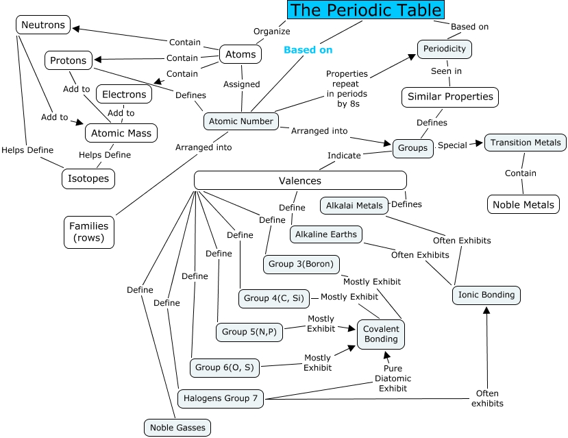 This Concept Map, created with IHMC CmapTools, has information related to: RwilkePeriodicTable, Group 3(Boron) Mostly Exhibit Covalent Bonding, Halogens Group 7 Often exhibits Ionic Bonding, Atoms Assigned Atomic Number, Neutrons Add to Atomic Mass, Valences Define Halogens Group 7, Valences Define Group 5(N,P), Valences Define Group 4(C, Si), Neutrons Helps Define Isotopes, Transition Metals Contain Noble Metals, Valences Define Alkaline Earths, Electrons Add to Atomic Mass, Valences Define Noble Gasses, Atoms Contain Protons, Valences Define Group 3(Boron), Atomic Number Properties repeat in periods by 8s Periodicity, The Periodic Table Based on Atomic Number, Group 4(C, Si) Mostly Exhibit Covalent Bonding, Group 5(N,P) Mostly Exhibit Covalent Bonding, Atoms Contain Neutrons, Alkalai Metals Often Exhibits Ionic Bonding