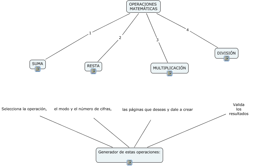 Este Cmap, tiene información relacionada con: OPERACIONES matemáticas básicas, RESTA el modo y el número de cifras, Generador de estas operaciones:, OPERACIONES MATEMÁTICAS 4 DIVISIÓN, SUMA Selecciona la operación, Generador de estas operaciones:, MULTIPLICACIÓN las páginas que deseas y dale a crear Generador de estas operaciones:, OPERACIONES MATEMÁTICAS 3 MULTIPLICACIÓN, OPERACIONES MATEMÁTICAS 1 SUMA, OPERACIONES MATEMÁTICAS 2 RESTA, DIVISIÓN Valida los resultados Generador de estas operaciones: