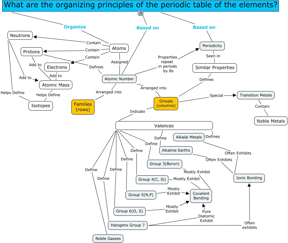 This Concept Map, created with IHMC CmapTools, has information related to: RwilkePeriodicTable, Group 3(Boron) Mostly Exhibit Covalent Bonding, Atomic Mass Helps Define Isotopes, Valences Define Group 5(N,P), Valences Define Noble Gasses, Halogens Group 7 Pure Diatomic Exhibit Covalent Bonding, Group 6(O, S) Mostly Exhibit Covalent Bonding, Groups (columns) Special Transition Metals, Neutrons Add to Atomic Mass, Valences Defines Alkalai Metals, Periodicity Seen in Similar Properties, Protons Add to Atomic Mass, Neutrons Helps Define Isotopes, Transition Metals Contain Noble Metals, Protons Defines Atomic Number, Similar Properties Defines Groups (columns), Valences Define Group 6(O, S), Atoms Assigned Atomic Number, Halogens Group 7 Often exhibits Ionic Bonding, Groups (columns) Indicate Valences, Electrons Add to Atomic Mass