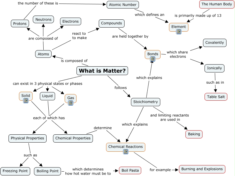 This Concept Map, created with IHMC CmapTools, has information related to: Lindsay Rymes, What is Matter? can exist in 3 physical states or phases Gas, Liquid each of which has Physical Properties, Stoichiometry and limiting reactants are used in Baking, Gas each of which has Physical Properties, What is Matter? is composed of Atoms, What is Matter? follows Stoichiometry, Atoms are composed of Neutrons, Chemical Reactions for example Burning and Explosions, Bonds which share electrons Ionically, Ionically such as in Table Salt, Compounds are held together by Bonds, Protons the number of these is Atomic Number, Physical Properties such as Freezing Point, Atoms react to to make Compounds, Bonds which share electrons Covalently, Physical Properties such as Boiling Point, Solid each of which has Chemical Properties, Boiling Point which determines how hot water must be to Boil Pasta, Stoichiometry which explains Bonds, Solid each of which has Physical Properties