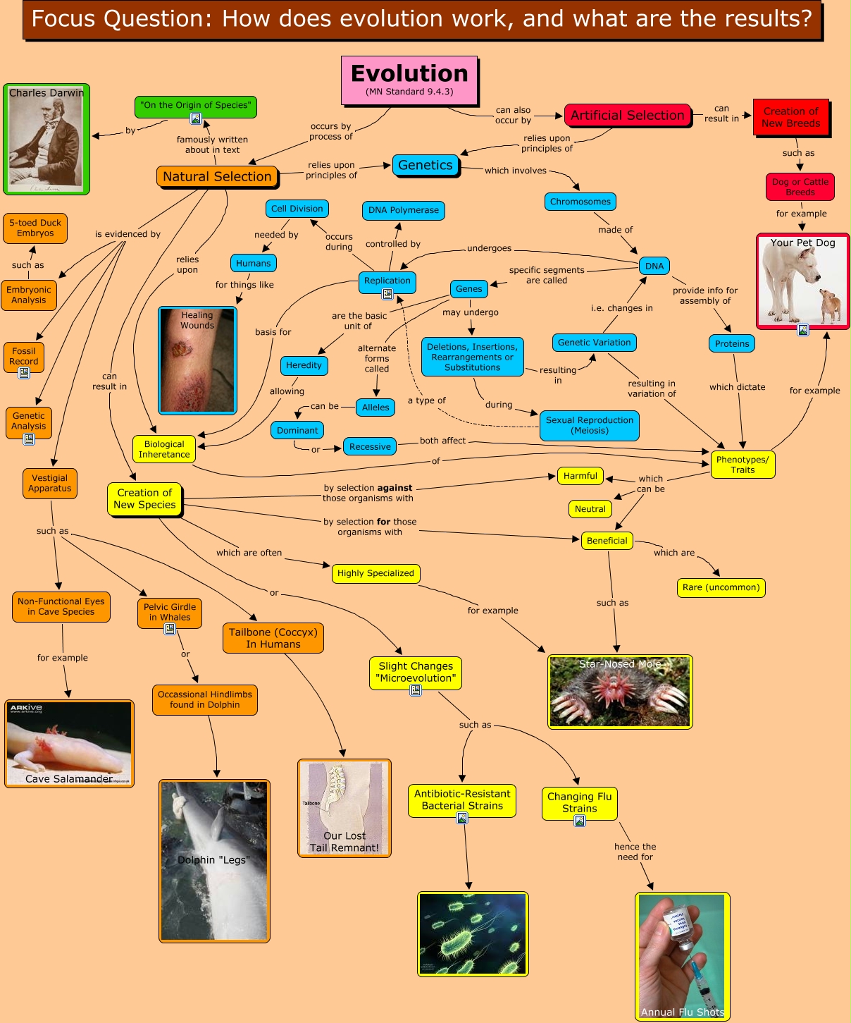 This Concept Map, created with IHMC CmapTools, has information related to: Evolution, Heredity allowing Biological Inheretance, Artificial Selection can result in Creation of New Breeds, Sexual Reproduction (Meiosis) a type of Replication, Recessive both affect Phenotypes/ Traits, Changing Flu Strains hence the need for Annual Flu Shots, Natural Selection is evidenced by Genetic Analysis, "On the Origin of Species" by Charles Darwin, Natural Selection is evidenced by Fossil Record, Genetic Variation resulting in variation of Phenotypes/ Traits, Deletions, Insertions, Rearrangements or Substitutions resulting in Genetic Variation, Phenotypes/ Traits for example Your Pet Dog, Genes may undergo Deletions, Insertions, Rearrangements or Substitutions, Occassional Hindlimbs found in Dolphin ???? Dolphin "Legs", Natural Selection can result in Creation of New Species, Creation of New Species by selection for those organisms with Beneficial, Slight Changes "Microevolution" such as Changing Flu Strains, Evolution (MN Standard 9.4.3) occurs by process of Natural Selection, Evolution (MN Standard 9.4.3) can also occur by Artificial Selection, Genes are the basic unit of Heredity, Replication controlled by DNA Polymerase