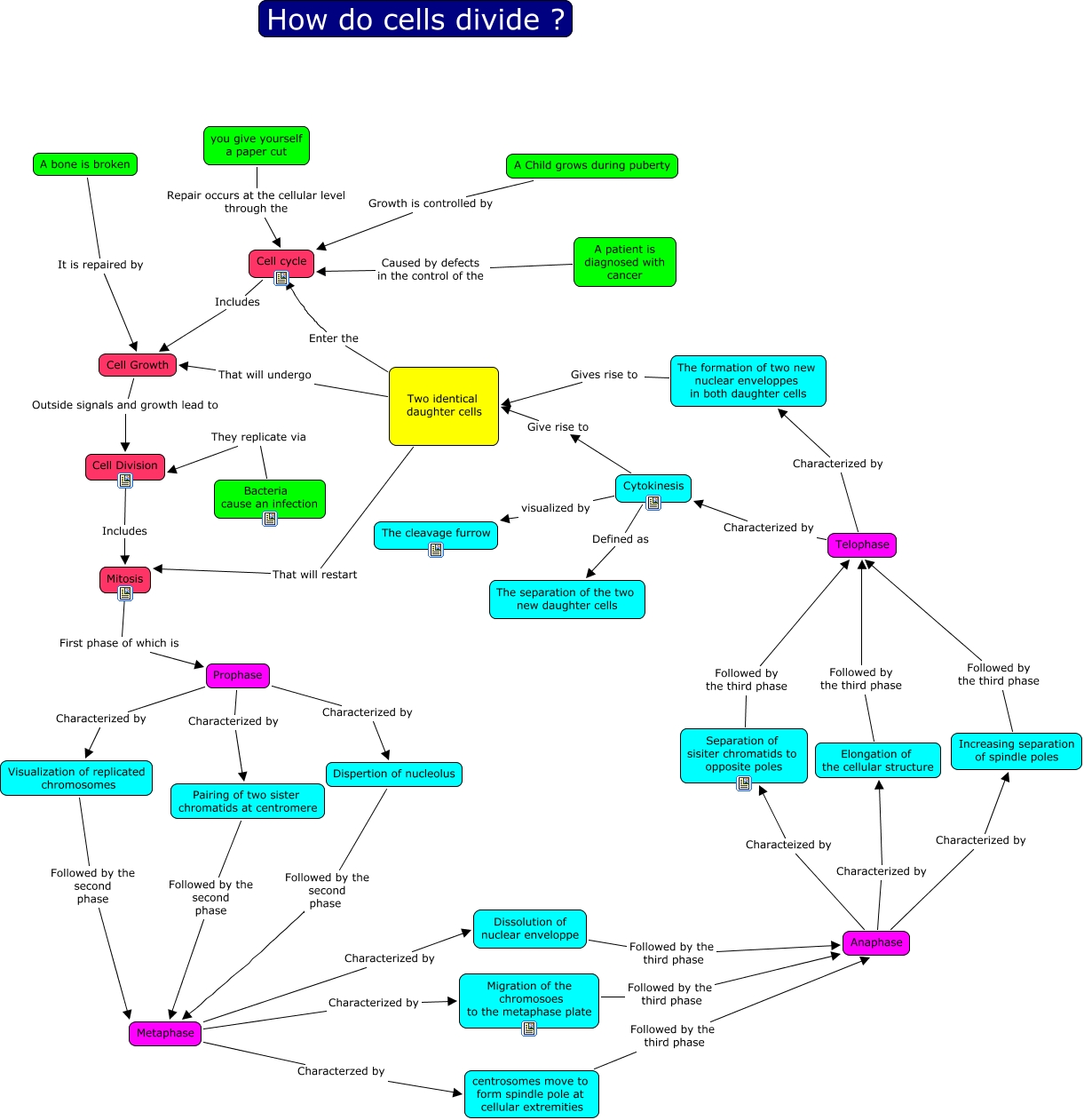 This Concept Map, created with IHMC CmapTools, has information related to: mitosis.cmap, A bone is broken It is repaired by Cell Growth, Separation of sisiter chromatids to opposite poles Followed by the third phase Telophase, Dispertion of nucleolus Followed by the second phase Metaphase, Anaphase Characterized by Increasing separation of spindle poles, Pairing of two sister chromatids at centromere Followed by the second phase Metaphase, Prophase Characterized by Visualization of replicated chromosomes, Metaphase Characterized by Dissolution of nuclear enveloppe, The formation of two new nuclear enveloppes in both daughter cells Gives rise to Two identical daughter cells, Mitosis First phase of which is Prophase, Prophase Characterized by Dispertion of nucleolus, Cytokinesis Defined as The separation of the two new daughter cells, Telophase Characterized by The formation of two new nuclear enveloppes in both daughter cells, A patient is diagnosed with cancer Caused by defects in the control of the Cell cycle, Bacteria cause an infection They replicate via Cell Division, Metaphase Characterzed by centrosomes move to form spindle pole at cellular extremities, Elongation of the cellular structure Followed by the third phase Telophase, centrosomes move to form spindle pole at cellular extremities Followed by the third phase Anaphase, Cytokinesis Give rise to Two identical daughter cells, Anaphase Characteized by Separation of sisiter chromatids to opposite poles, Cytokinesis visualized by The cleavage furrow