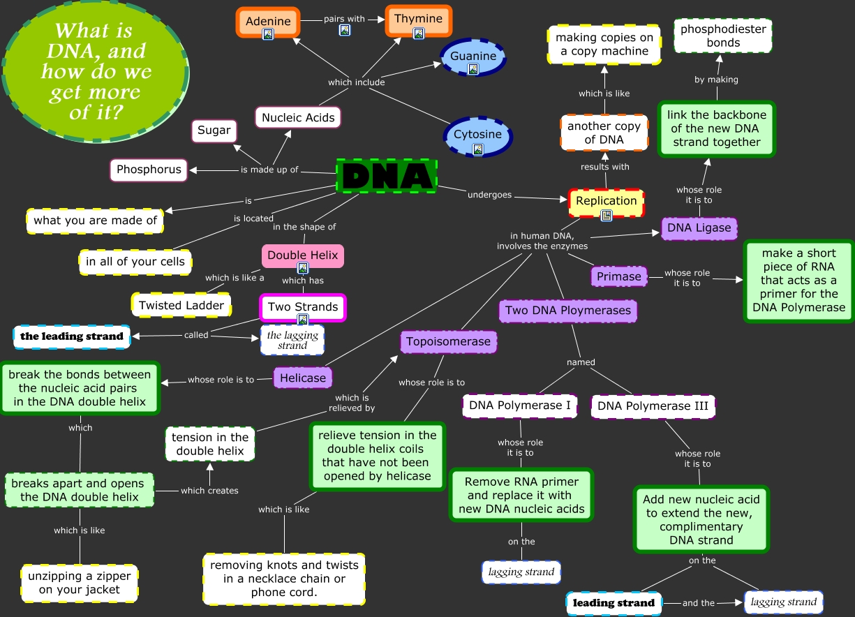 This Concept Map, created with IHMC CmapTools, has information related to: Andrea Appel Final cmap, Nucleic Acids which include Cytosine, Adenine pairs with Thymine, Nucleic Acids which include Adenine, Primase whose role it is to make a short piece of RNA that acts as a primer for the DNA Polymerase, Replication in human DNA, involves the enzymes Helicase, DNA is what you are made of, DNA is made up of Sugar, another copy of DNA which is like making copies on a copy machine, Replication in human DNA, involves the enzymes Topoisomerase, breaks apart and opens the DNA double helix which is like unzipping a zipper on your jacket, leading strand and the lagging strand, Add new nucleic acid to extend the new, complimentary DNA strand on the lagging strand, DNA Polymerase I whose role it is to Remove RNA primer and replace it with new DNA nucleic acids, Two DNA Ploymerases named DNA Polymerase III, Remove RNA primer and replace it with new DNA nucleic acids on the lagging strand, Replication in human DNA, involves the enzymes Primase, Double Helix which has Two Strands, DNA Ligase whose role it is to link the backbone of the new DNA strand together, Nucleic Acids which include Guanine, DNA Polymerase III whose role it is to Add new nucleic acid to extend the new, complimentary DNA strand