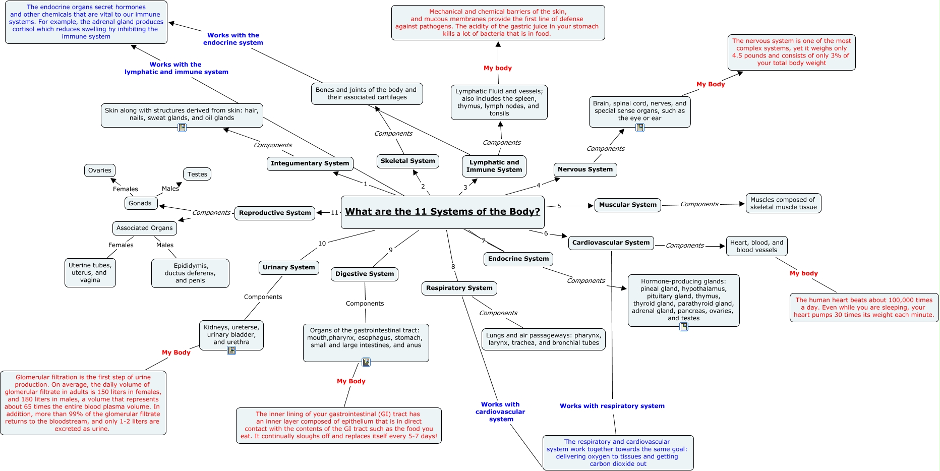 This Concept Map, created with IHMC CmapTools, has information related to: Christina Polk - CMAP, What are the 11 Systems of the Body? 8 Respiratory System, What are the 11 Systems of the Body? 10 Urinary System, What are the 11 Systems of the Body? 4 Nervous System, Respiratory System Works with cardiovascular system The respiratory and cardiovascular system work together towards the same goal: delivering oxygen to tissues and getting carbon dioxide out, What are the 11 Systems of the Body? 3 Lymphatic and Immune System, Associated Organs Males Epididymis, ductus deferens, and penis, Lymphatic Fluid and vessels; also includes the spleen, thymus, lymph nodes, and tonsils My body Mechanical and chemical barriers of the skin, and mucous membranes provide the first line of defense against pathogens. The acidity of the gastric juice in your stomach kills a lot of bacteria that is in food., What are the 11 Systems of the Body? 1 Integumentary System, Reproductive System Components Gonads, What are the 11 Systems of the Body? 5 Muscular System, What are the 11 Systems of the Body? 6 Cardiovascular System, Nervous System Components Brain, spinal cord, nerves, and special sense organs, such as the eye or ear, What are the 11 Systems of the Body? 9 Digestive System, Brain, spinal cord, nerves, and special sense organs, such as the eye or ear My Body The nervous system is one of the most complex systems, yet it weighs only 4.5 pounds and consists of only 3% of your total body weight, Associated Organs Females Uterine tubes, uterus, and vagina, Kidneys, ureterse, urinary bladder, and urethra My Body Glomerular filtration is the first step of urine production. On average, the daily volume of glomerular filtrate in adults is 150 liters in females, and 180 liters in males, a volume that represents about 65 times the entire blood plasma volume. In addition, more than 99% of the glomerular filtrate returns to the bloodstream, and only 1-2 liters are excreted as urine., What are the 11 Systems of the Body? 7 Endocrine System, Urinary System Components Kidneys, ureterse, urinary bladder, and urethra, Skeletal System Components Bones and joints of the body and their associated cartilages, Endocrine System Works with the lymphatic and immune system The endocrine organs secret hormones and other chemicals that are vital to our immune systems. For example, the adrenal gland produces cortisol which reduces swelling by inhibiting the immune system