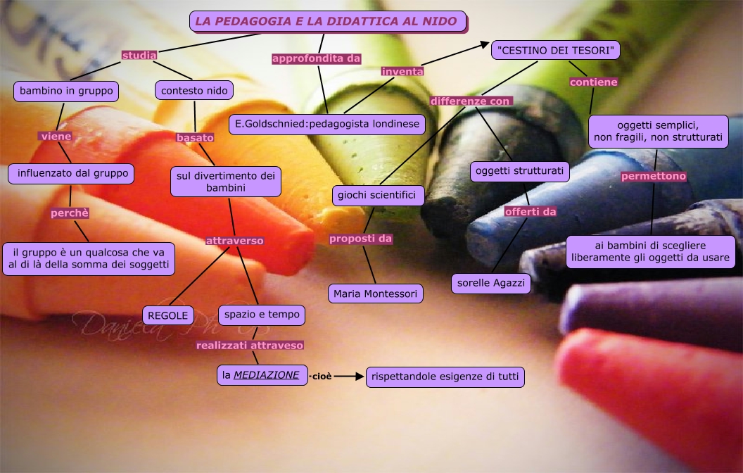 Questa Cmap, creata con IHMC CmapTools, contiene informazioni relative a: la pedagogia e la didattica, influenzato dal gruppo perchè il gruppo è un qualcosa che va al di là della somma dei soggetti, la MEDIAZIONE cioè rispettandole esigenze di tutti, bambino in gruppo viene influenzato dal gruppo, sul divertimento dei bambini attraverso spazio e tempo, sul divertimento dei bambini attraverso REGOLE, oggetti strutturati offerti da sorelle Agazzi, LA PEDAGOGIA E LA DIDATTICA AL NIDO approfondita da E.Goldschnied:pedagogista londinese, "CESTINO DEI TESORI" differenze con giochi scientifici, LA PEDAGOGIA E LA DIDATTICA AL NIDO studia bambino in gruppo, oggetti semplici, non fragili, non strutturati permettono ai bambini di scegliere liberamente gli oggetti da usare, "CESTINO DEI TESORI" contiene oggetti semplici, non fragili, non strutturati, spazio e tempo realizzati attraveso la MEDIAZIONE, giochi scientifici proposti da Maria Montessori, contesto nido basato sul divertimento dei bambini, LA PEDAGOGIA E LA DIDATTICA AL NIDO studia contesto nido, "CESTINO DEI TESORI" differenze con oggetti strutturati, E.Goldschnied:pedagogista londinese inventa "CESTINO DEI TESORI"