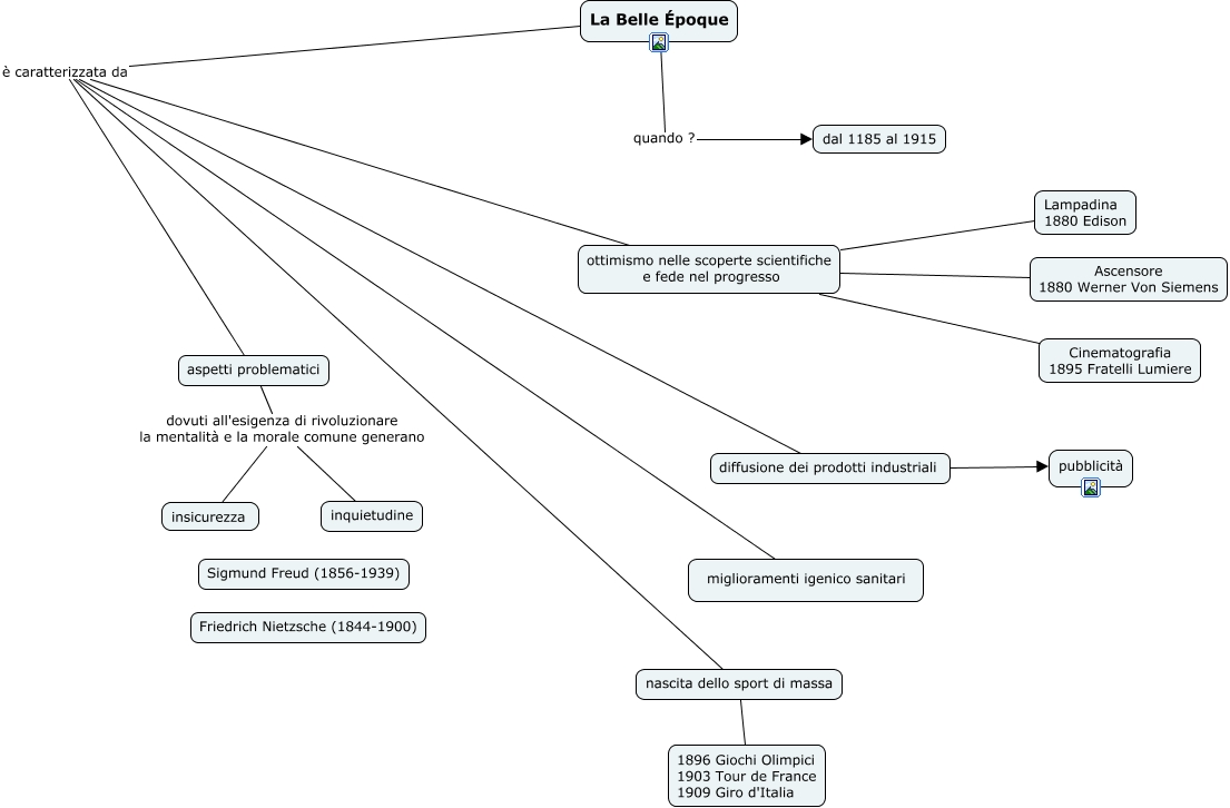 Questa Cmap, creata con IHMC CmapTools, contiene informazioni relative a: 2 Belle Epoque, aspetti problematici dovuti all'esigenza di rivoluzionare la mentalità e la morale comune generano insicurezza, La Belle Époque è caratterizzata da miglioramenti igenico sanitari, La Belle Époque quando ? dal 1185 al 1915, La Belle Époque è caratterizzata da aspetti problematici, ottimismo nelle scoperte scientifiche e fede nel progresso Lampadina 1880 Edison, ottimismo nelle scoperte scientifiche e fede nel progresso Cinematografia 1895 Fratelli Lumiere, La Belle Époque è caratterizzata da ottimismo nelle scoperte scientifiche e fede nel progresso, La Belle Époque è caratterizzata da diffusione dei prodotti industriali, diffusione dei prodotti industriali pubblicità, aspetti problematici dovuti all'esigenza di rivoluzionare la mentalità e la morale comune generano inquietudine, ottimismo nelle scoperte scientifiche e fede nel progresso Ascensore 1880 Werner Von Siemens, La Belle Époque è caratterizzata da nascita dello sport di massa, nascita dello sport di massa 1896 Giochi Olimpici 1903 Tour de France 1909 Giro d'Italia