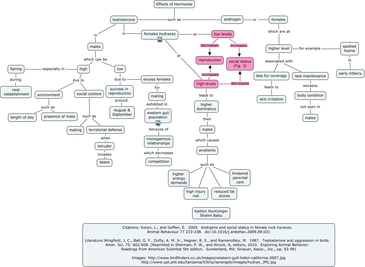 This Concept Map, created with IHMC CmapTools, has information related to: SB KaHunt, intruder invades space, body condition not seen in males, females hydraxes at low levels, environment such as length of day, spotted hyena in early infancy, higher level for example spotted hyena, problems which causes males, females hydraxes at high levels, social context such as terretorial defense, high levels leads to higher dominance, higher dominance then males, problems such as higher energy demands, androgen in females, western gull population because of monogamous relationships, females which are at higher level, problems such as hindered parental care, high especially in Spring, success in reproduction around August & September, high due to social context, social context such as mating