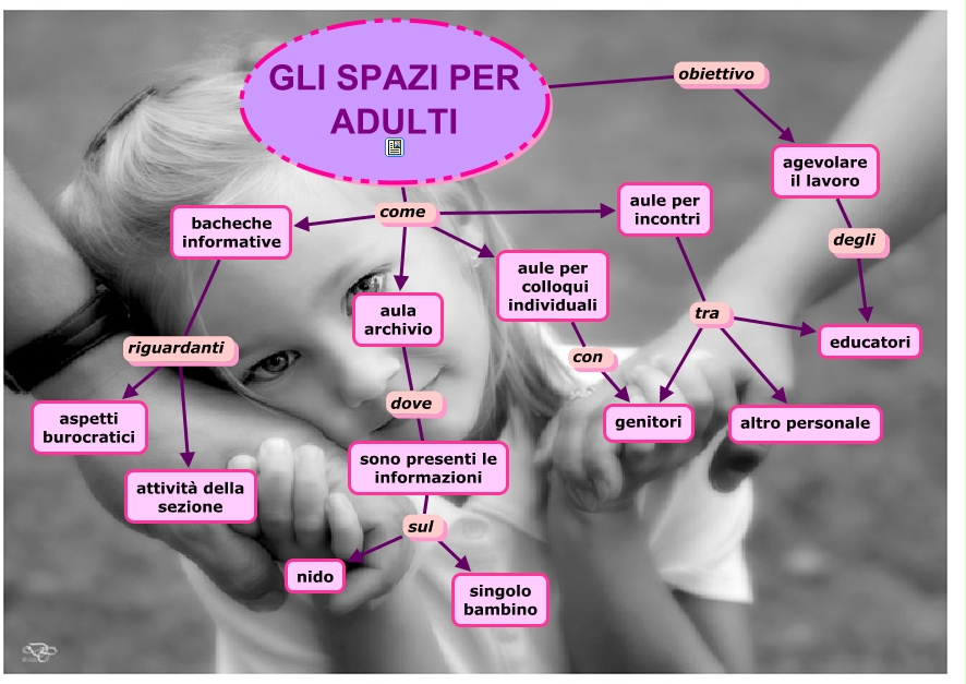 Questa Cmap, creata con IHMC CmapTools, contiene informazioni relative a: gli spazi per adulti, bacheche informative riguardanti aspetti burocratici, GLI SPAZI PER ADULTI come aule per incontri, GLI SPAZI PER ADULTI come aula archivio, GLI SPAZI PER ADULTI come aule per colloqui individuali, aule per incontri tra educatori, bacheche informative riguardanti attività della sezione, GLI SPAZI PER ADULTI come bacheche informative, aule per incontri tra genitori, GLI SPAZI PER ADULTI obiettivo agevolare il lavoro, sono presenti le informazioni sul singolo bambino, aule per incontri tra altro personale, agevolare il lavoro degli educatori, sono presenti le informazioni sul nido, aule per colloqui individuali con genitori, aula archivio dove sono presenti le informazioni