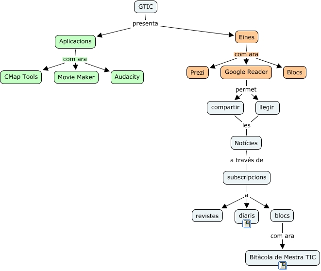 Aquest mapa conceptual conté informació relacionada amb: GTIC silvia, Notícies a través de subscripcions, subscripcions a blocs, compartir les Notícies, Google Reader permet llegir, GTIC presenta Aplicacions, llegir les Notícies, blocs com ara Bitàcola de Mestra TIC, GTIC presenta Eines, Eines com ara Blocs, Eines com ara Google Reader, subscripcions a diaris, Eines com ara Prezi, Aplicacions com ara Audacity, Aplicacions com ara CMap Tools, Aplicacions com ara Movie Maker, Google Reader permet compartir, subscripcions a revistes