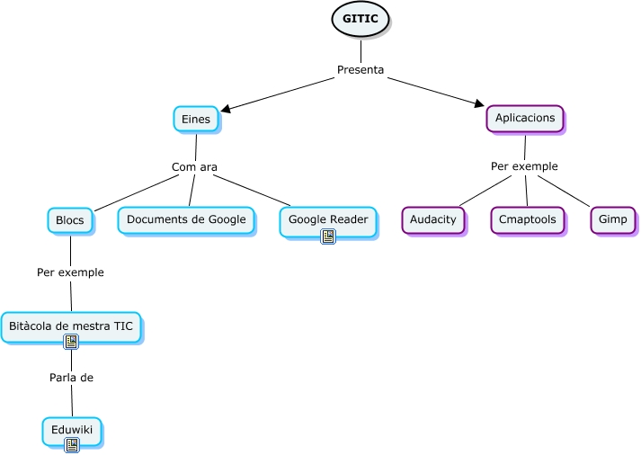 Aquest mapa conceptual conté informació relacionada amb: Sense títol 1, Bitàcola de mestra TIC Parla de Eduwiki, Eines Com ara Documents de Google, Eines Com ara Google Reader, Aplicacions Per exemple Gimp, Blocs Per exemple Bitàcola de mestra TIC, Aplicacions Per exemple Audacity, Eines Com ara Blocs, GITIC Presenta Eines, Aplicacions Per exemple Cmaptools, GITIC Presenta Aplicacions