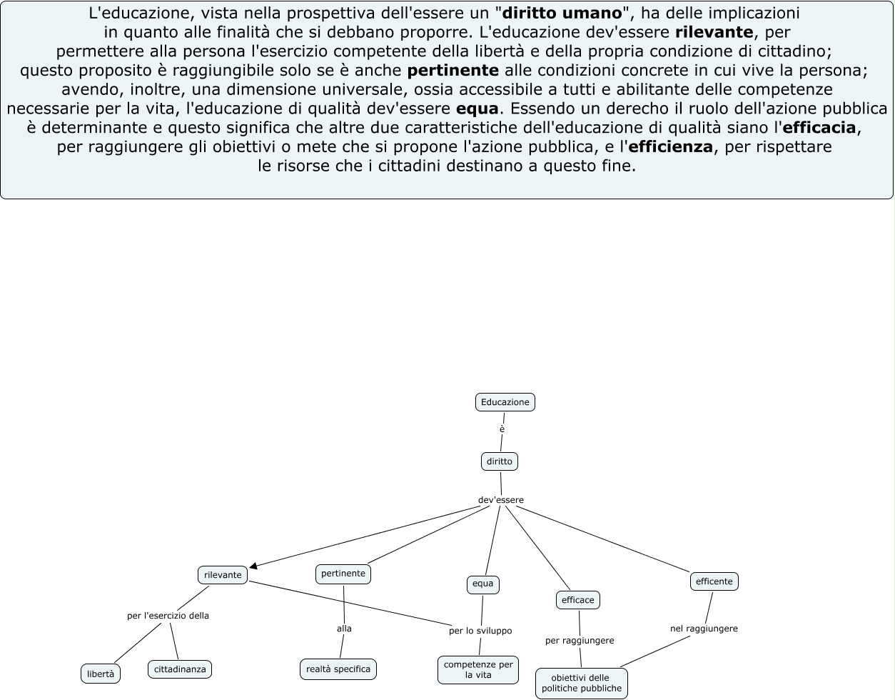 Questa Cmap, creata con IHMC CmapTools, contiene informazioni relative a: Educazione di qualitá, rilevante per l'esercizio della cittadinanza, diritto dev'essere efficente, diritto dev'essere equa, efficente nel raggiungere obiettivi delle politiche pubbliche, rilevante per lo sviluppo competenze per la vita, diritto dev'essere pertinente, diritto dev'essere efficace, diritto dev'essere rilevante, efficace per raggiungere obiettivi delle politiche pubbliche, equa per lo sviluppo competenze per la vita, rilevante per l'esercizio della libertà, Educazione è diritto, pertinente alla realtà specifica