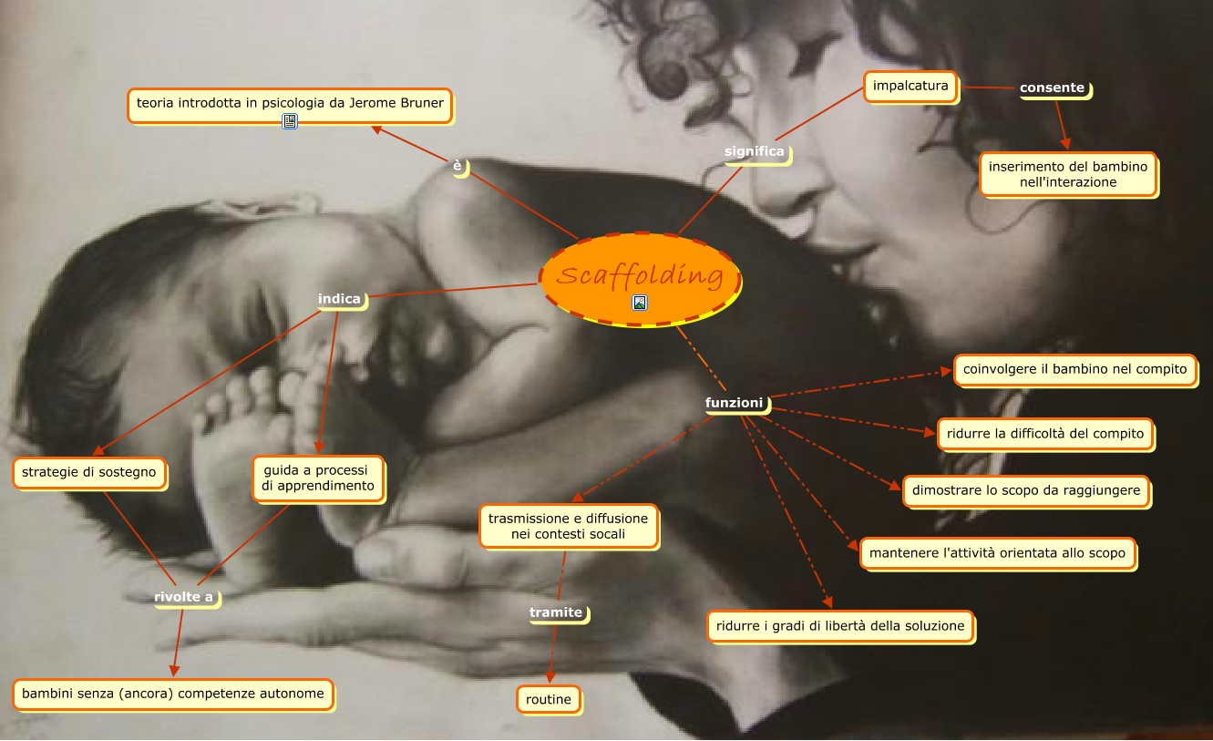 Questa Cmap, creata con IHMC CmapTools, contiene informazioni relative a: Scaffolding, Scaffolding è teoria introdotta in psicologia da Jerome Bruner, strategie di sostegno rivolte a bambini senza (ancora) competenze autonome, Scaffolding significa impalcatura, Scaffolding funzioni ridurre i gradi di libertà della soluzione, Scaffolding funzioni trasmissione e diffusione nei contesti socali, impalcatura consente inserimento del bambino nell'interazione, Scaffolding funzioni coinvolgere il bambino nel compito, guida a processi di apprendimento rivolte a bambini senza (ancora) competenze autonome, Scaffolding funzioni ridurre la difficoltà del compito, trasmissione e diffusione nei contesti socali tramite routine, Scaffolding indica guida a processi di apprendimento, Scaffolding funzioni mantenere l'attività orientata allo scopo, Scaffolding indica strategie di sostegno, Scaffolding funzioni dimostrare lo scopo da raggiungere