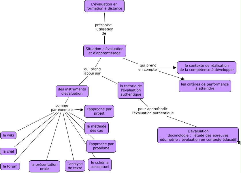 Cette carte de concepts créée avec IHMC CmapTools traite de: DevoirfinalDanielB, Situation d'évaluation et d'apprentissage qui prend appui sur des instruments d'évaluation, des instruments d'évaluation comme par exemple la chat, des instruments d'évaluation comme par exemple l'approche par projet, L'évaluation en formation à distance préconise l'utilisation de Situation d'évaluation et d'apprentissage, des instruments d'évaluation comme par exemple le wiki, des instruments d'évaluation comme par exemple le forum, la théorie de l'évaluation authentique pour approfondir l'évaluation authentique L'évaluation docimologie : l'étude des épreuves édumétrie : évaluation en contexte éducatif, des instruments d'évaluation comme par exemple la méthode des cas, Situation d'évaluation et d'apprentissage qui prend en compte le contexte de réalisation de la compétence à développer, Situation d'évaluation et d'apprentissage qui prend appui sur la théorie de l'évaluation authentique, des instruments d'évaluation comme par exemple le schéma conceptuel, des instruments d'évaluation comme par exemple la présentation orale, Situation d'évaluation et d'apprentissage qui prend en compte les critères de performance à atteindre, des instruments d'évaluation comme par exemple l'approche par problème, des instruments d'évaluation comme par exemple l'analyse de texte