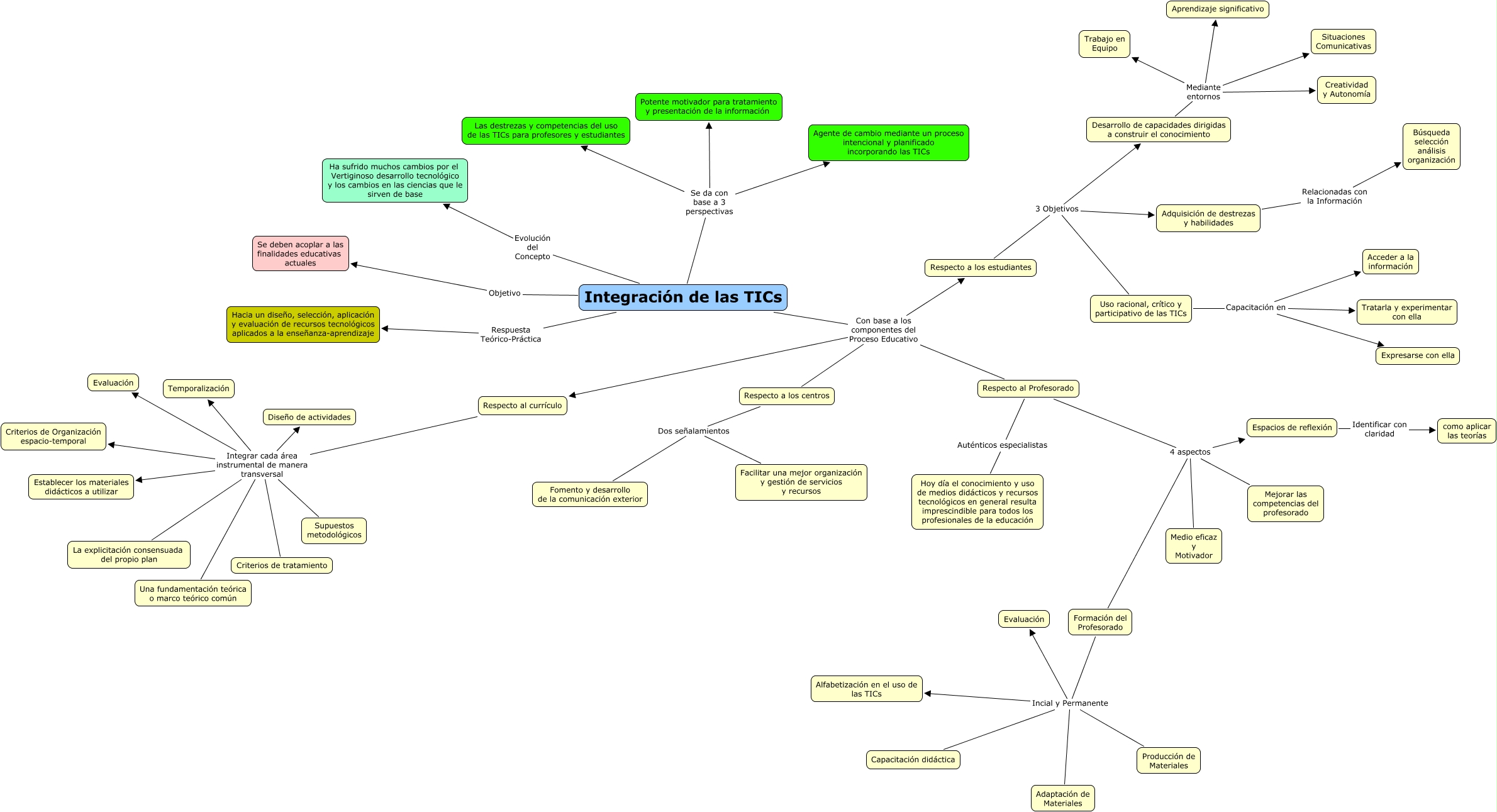 Este Cmap, tiene información relacionada con: Integración de las TICs, Respecto al currículo Integrar cada área instrumental de manera transversal Supuestos metodológicos, Desarrollo de capacidades dirigidas a construir el conocimiento Mediante entornos Creatividad y Autonomía, Respecto a los estudiantes 3 Objetivos Adquisición de destrezas y habilidades, Respecto al currículo Integrar cada área instrumental de manera transversal Temporalización, Integración de las TICs Se da con base a 3 perspectivas Agente de cambio mediante un proceso intencional y planificado incorporando las TICs, Formación del Profesorado Incial y Permanente Capacitación didáctica, Espacios de reflexión Identificar con claridad como aplicar las teorías, Integración de las TICs Con base a los componentes del Proceso Educativo Respecto a los estudiantes, Uso racional, crítico y participativo de las TICs Capacitación en Tratarla y experimentar con ella, Desarrollo de capacidades dirigidas a construir el conocimiento Mediante entornos Situaciones Comunicativas, Integración de las TICs Objetivo Se deben acoplar a las finalidades educativas actuales, Integración de las TICs Respuesta Teórico-Práctica Hacia un diseño, selección, aplicación y evaluación de recursos tecnológicos aplicados a la enseñanza-aprendizaje, Respecto al currículo Integrar cada área instrumental de manera transversal Evaluación, Respecto al currículo Integrar cada área instrumental de manera transversal Criterios de Organización espacio-temporal, Adquisición de destrezas y habilidades Relacionadas con la Información Búsqueda selección análisis organización, Respecto a los centros Dos señalamientos Facilitar una mejor organización y gestión de servicios y recursos, Respecto al Profesorado Auténticos especialistas Hoy día el conocimiento y uso de medios didácticos y recursos tecnológicos en general resulta imprescindible para todos los profesionales de la educación, Respecto a los estudiantes 3 Objetivos Uso racional, crítico y participativo de las TICs, Respecto a los estudiantes 3 Objetivos Desarrollo de capacidades dirigidas a construir el conocimiento, Integración de las TICs Con base a los componentes del Proceso Educativo Respecto al Profesorado