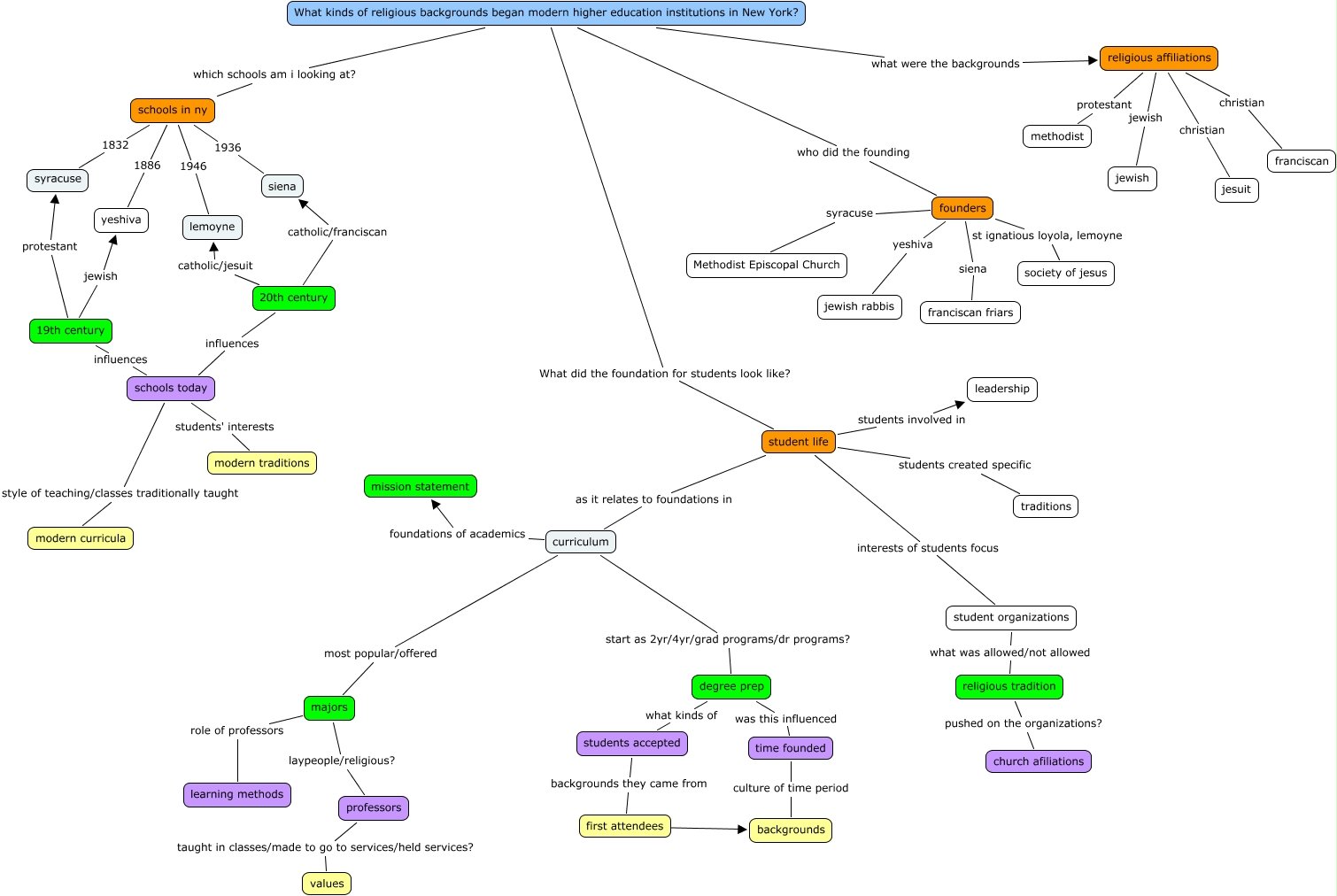 This Concept Map, created with IHMC CmapTools, has information related to: BPiraino-religion, 19th century influences schools today, founders st ignatious loyola, lemoyne society of jesus, schools today students' interests modern traditions, students accepted backgrounds they came from first attendees, degree prep was this influenced time founded, 19th century jewish yeshiva, 20th century influences schools today, majors laypeople/religious? professors, majors role of professors learning methods, student life as it relates to foundations in curriculum, 20th century catholic/franciscan siena, religious affiliations jewish jewish, degree prep what kinds of students accepted, time founded culture of time period backgrounds, schools in ny 1936 siena, first attendees ???? backgrounds, founders siena franciscan friars, religious affiliations protestant methodist, What kinds of religious backgrounds began modern higher education institutions in New York? who did the founding founders, schools in ny 1832 syracuse