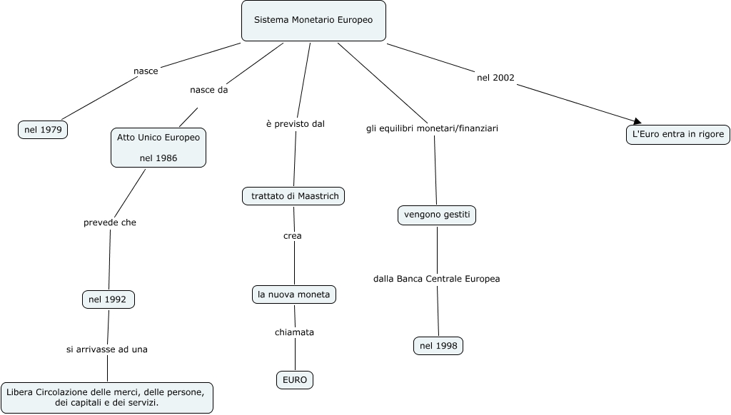 Questa Cmap, creata con IHMC CmapTools, contiene informazioni relative a: Sistema monetario europeo - Livia C. Da Silva, Sistema Monetario Europeo nel 2002 L'Euro entra in rigore, vengono gestiti dalla Banca Centrale Europea nel 1998, Atto Unico Europeo nel 1986 prevede che nel 1992, Sistema Monetario Europeo è previsto dal trattato di Maastrich, la nuova moneta chiamata EURO, Sistema Monetario Europeo nasce nel 1979, Sistema Monetario Europeo nasce da Atto Unico Europeo nel 1986, nel 1992 si arrivasse ad una Libera Circolazione delle merci, delle persone, dei capitali e dei servizi., trattato di Maastrich crea la nuova moneta, Sistema Monetario Europeo gli equilibri monetari/finanziari vengono gestiti