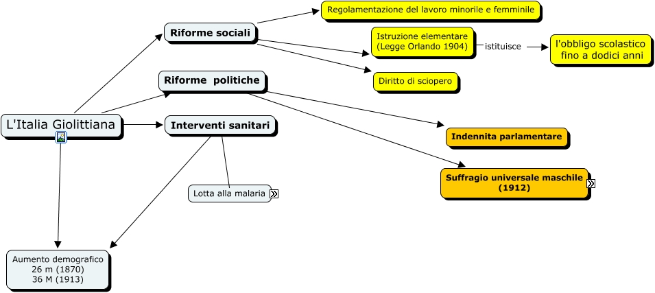 Questa Cmap, creata con IHMC CmapTools, contiene informazioni relative a: 3 l'Italia Giolittiana, Istruzione elementare (Legge Orlando 1904) istituisce l'obbligo scolastico fino a dodici anni, Interventi sanitari Aumento demografico 26 m (1870) 36 M (1913), L'Italia Giolittiana Riforme politiche, Riforme sociali Regolamentazione del lavoro minorile e femminile, Riforme sociali Istruzione elementare (Legge Orlando 1904), Interventi sanitari ad esempio Distribuzione gratuita di chinino, L'Italia Giolittiana Interventi sanitari, Riforme politiche Indennita parlamentare, Distribuzione gratuita di chinino che riduce i malarici calano dal 31% al 2% in otto anni, L'Italia Giolittiana Aumento demografico 26 m (1870) 36 M (1913), Riforme sociali Diritto di sciopero, L'Italia Giolittiana Riforme sociali, Riforme politiche Suffragio universale maschile (1912)