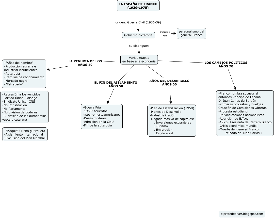 Este Cmap, tiene información relacionada con: franco, Varias etapas en base a la economía LA PENURIA DE LOS AÑOS 40 -"Años del hambre" -Producción agraria e industrial insuficientes -Autarquía -Cartillas de racionamiento -Mercado negro -"Estraperlo", Varias etapas en base a la economía LOS CAMBIOS POLÍTICOS AÑOS 70 -Franco nombra sucesor al entonces Príncipe de España, D. Juan Carlos de Borbón -Primeras protestas y huelgas Creación de Comisiones Obreras -Protesta estudiantil -Reivindicaciones nacionalistas -Aparición de E.T.A. -1973- Asesinato de Carrero Blanco -Crisis económica mundial -Muerte del general Franco: reinado de Juan Carlos I, Gobierno dictatorial basado en personalismo del general Franco, Gobierno dictatorial se distinguen Varias etapas en base a la economía, Varias etapas en base a la economía AÑOS DEL DESARROLLO AÑOS 60 -Plan de Estabilización (1959) -Planes de Desarrollo -Industrialización -Llegada masiva de capitales: . Inversiones extranjeras . Turismo . Emigración . Éxodo rural, Varias etapas en base a la economía EL FIN DEL AISLAMIENTO AÑOS 50 -Guerra Fría -1953: acuerdos hispano-norteamericanos -Bases militares -Admisión en la ONU -Fin de la autarquía, LA ESPAÑA DE FRANCO (1939-1975) origen: Guerra Civil (1936-39) Gobierno dictatorial