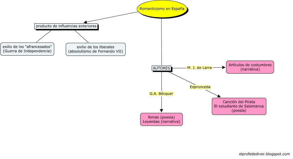 Este Cmap, tiene información relacionada con: romanticismo_españa, producto de influencias exteriores ???? exilio de los liberales (absolutismo de Fernando VII), Romanticismo en España ???? AUTORES, Romanticismo en España ???? producto de influencias exteriores, AUTORES M. J. de Larra Artículos de costumbres (narrativa), AUTORES G.A. Bécquer Rimas (poesía) Leyendas (narrativa), AUTORES Espronceda Canción del Pirata El estudiante de Salamanca (poesía), producto de influencias exteriores ???? exilio de los "afrancesados" (Guerra de Independencia)