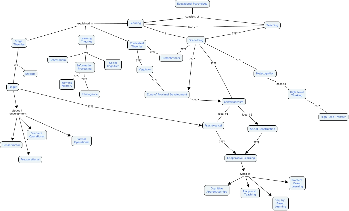 This Concept Map, created with IHMC CmapTools, has information related to: Clusters 1 - 10, Social Construction ???? Cooperative Learning, Social Cognitive Learning Theories, Working Memory ???? Information Processing, Zone of Proximal Development ???? Constructivism, Piaget stages in development Formal Operational, Learning Theories explained in Stage Theories, Learning consists of Teaching, Metacognition ???? Scaffolding, Contextual Theories explained in Stage Theories, Cooperative Learning types of Cognitive Apprenticeships, Learning leads to Teaching, Vygotsky ???? Contextual Theories, Piaget are Stage Theories, Constructivism idea #2 Social Construction, Zone of Proximal Development ???? Vygotsky, High Road Transfer ???? High Level Thinking, Contextual Theories explained in Learning, Psychological ???? Cooperative Learning, Brofenbrenner ???? Contextual Theories, Scaffolding ???? Constructivism