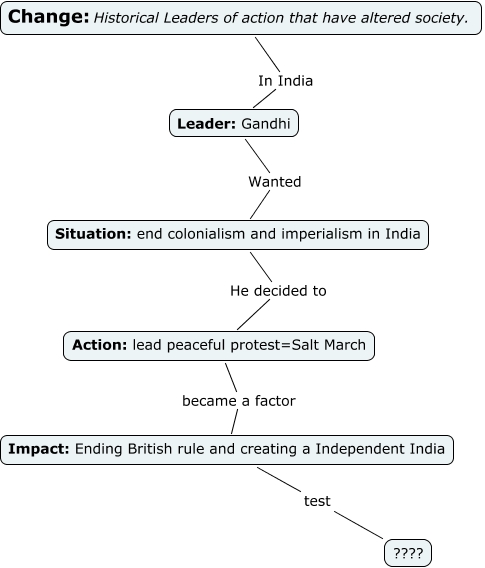 This Concept Map, created with IHMC CmapTools, has information related to: Change- Historical Leaders of action that have altered society-Gandhi, Situation: end colonialism and imperialism in India He decided to Action: lead peaceful protest=Salt March, Leader: Gandhi Wanted Situation: end colonialism and imperialism in India, Action: lead peaceful protest=Salt March became a factor Impact: Ending British rule and creating a Independent India, Impact: Ending British rule and creating a Independent India test ????, Change: Historical Leaders of action that have altered society. In India Leader: Gandhi
