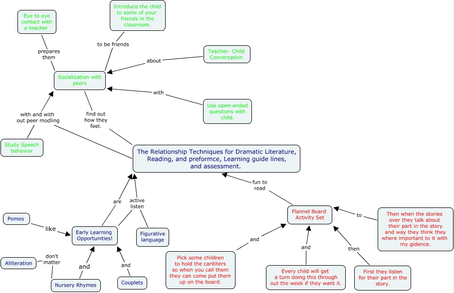 This Concept Map, created with IHMC CmapTools, has information related to: ECPK320 Relationship Techiques for Dramatic Literature and Reading, Study Speech behavior with and with out peer modling The Relationship Techniques for Dramatic Literature, Reading, and preformce, Learning guide lines, and assessment., Figurative language active listen Early Learning Opportunities!, Early Learning Opportunities! are The Relationship Techniques for Dramatic Literature, Reading, and preformce, Learning guide lines, and assessment., Eye to eye contact with a teacher prepares them Socialization with peers, Flannel Board Activity Set fun to read The Relationship Techniques for Dramatic Literature, Reading, and preformce, Learning guide lines, and assessment., Pomes like Early Learning Opportunities!, Nursery Rhymes and Early Learning Opportunities!, Introduce the child to some of your friends in the classroom. to be friends Socialization with peers, First they listen for their part in the story. then Flannel Board Activity Set, Pick some children to hold the carititers so when you call them they can come put them up on the board. and Flannel Board Activity Set, Alliteration don't matter Nursery Rhymes, Figurative language active listen The Relationship Techniques for Dramatic Literature, Reading, and preformce, Learning guide lines, and assessment., Couplets and Early Learning Opportunities!, Teacher- Child Conversation about Socialization with peers, Then when the stories over they talk about their part in the story and way they think they where important to it with my gidence. to Flannel Board Activity Set, Socialization with peers find out how they feel. The Relationship Techniques for Dramatic Literature, Reading, and preformce, Learning guide lines, and assessment., Every child will get a turn doing this through out the week if they want it. and Flannel Board Activity Set, Study Speech behavior with and with out peer modling Socialization with peers, Use open-ended questions with child. with Socialization with peers