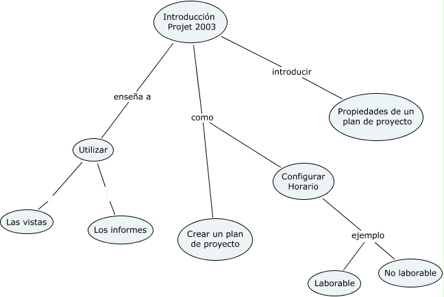 Este Cmap, tiene información relacionada con: Introducción, Utilizar Las vistas, Introducción Projet 2003 como Crear un plan de proyecto, Introducción Projet 2003 como Configurar Horario, Utilizar Los informes, Introducción Projet 2003 enseña a Utilizar, Configurar Horario ejemplo No laborable, Introducción Projet 2003 introducir Propiedades de un plan de proyecto, Configurar Horario ejemplo Laborable