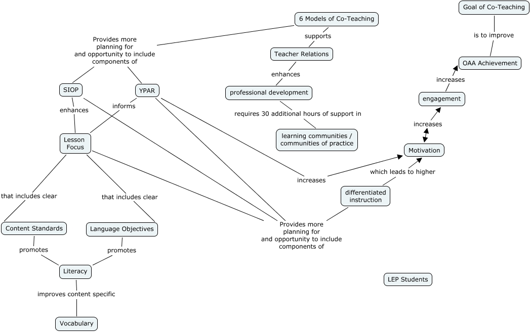 This Concept Map, created with IHMC CmapTools, has information related to: PCMS Science-ESL CoTeaching, 6 Models of Co-Teaching Provides more planning for and opportunity to include components of YPAR, Lesson Focus that includes clear Language Objectives, 6 Models of Co-Teaching Provides more planning for and opportunity to include components of SIOP, professional development requires 30 additional hours of support in learning communities / communities of practice, YPAR informs Lesson Focus, engagement increases OAA Achievement, Lesson Focus Provides more planning for and opportunity to include components of differentiated instruction, Literacy improves content specific Vocabulary, Lesson Focus that includes clear Content Standards, Teacher Relations enhances professional development, differentiated instruction which leads to higher Motivation, YPAR increases Motivation, Goal of Co-Teaching is to improve OAA Achievement, Content Standards promotes Literacy, YPAR Provides more planning for and opportunity to include components of differentiated instruction, Language Objectives promotes Literacy, 6 Models of Co-Teaching supports Teacher Relations, SIOP enhances Lesson Focus, SIOP Provides more planning for and opportunity to include components of differentiated instruction