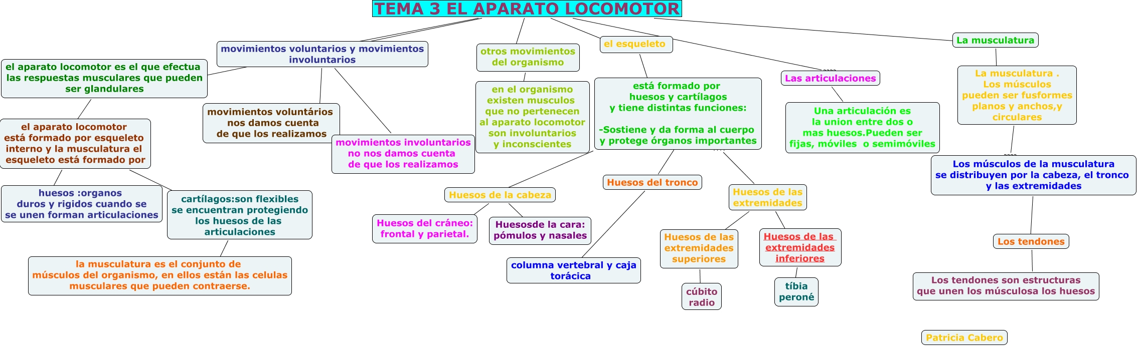 Este Cmap, tiene información relacionada con: Patricia trabajo cono tema 3, movimientos voluntarios y movimientos involuntarios ???? movimientos voluntários nos damos cuenta de que los realizamos, movimientos voluntarios y movimientos involuntarios ???? movimientos involuntarios no nos damos cuenta de que los realizamos, TEMA 3 EL APARATO LOCOMOTOR ???? el esqueleto, el aparato locomotor está formado por esqueleto interno y la musculatura el esqueleto está formado por ???? huesos :organos duros y rigidos cuando se se unen forman articulaciones, Huesos de las extremidades superiores ???? cúbito radio, Huesos de las extremidades superiores ???? cúbito radio, Huesos de las extremidades ???? Huesos de las extremidades inferiores, está formado por huesos y cartílagos y tiene distintas funciones: -Sostiene y da forma al cuerpo y protege órganos importantes ???? Huesos del tronco, Huesos de la cabeza ???? Huesos del cráneo: frontal y parietal., Huesos del tronco ???? columna vertebral y caja torácica, TEMA 3 EL APARATO LOCOMOTOR ???? el aparato locomotor es el que efectua las respuestas musculares que pueden ser glandulares, Huesos de las extremidades inferiores ???? tíbia peroné, Huesos de la cabeza ???? Huesosde la cara: pómulos y nasales, TEMA 3 EL APARATO LOCOMOTOR ???? La musculatura, TEMA 3 EL APARATO LOCOMOTOR ???? movimientos voluntarios y movimientos involuntarios, el esqueleto ???? está formado por huesos y cartílagos y tiene distintas funciones: -Sostiene y da forma al cuerpo y protege órganos importantes, el aparato locomotor está formado por esqueleto interno y la musculatura el esqueleto está formado por ???? cartílagos:son flexibles se encuentran protegiendo los huesos de las articulaciones, TEMA 3 EL APARATO LOCOMOTOR ???? Las articulaciones, está formado por huesos y cartílagos y tiene distintas funciones: -Sostiene y da forma al cuerpo y protege órganos importantes ???? Huesos de la cabeza, Huesos de las extremidades ???? Huesos de las extremidades superiores